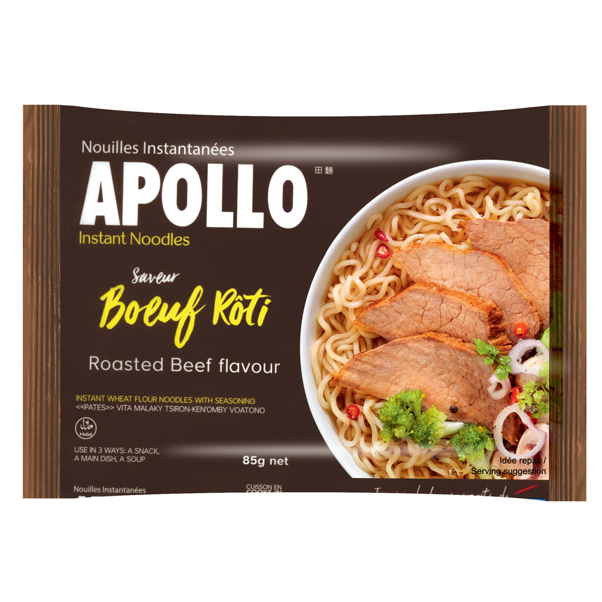 Nouilles déshydratées, cuisson rapide à l'eau chaude et servir avec le bouillon. Recette originale mauricienne aromatisée aux bœufs.