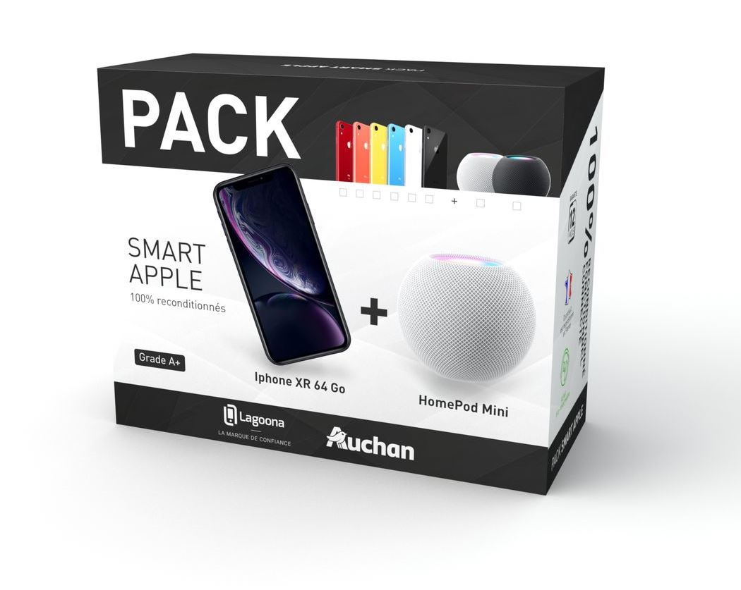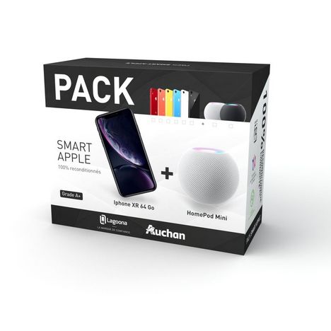 Le pack iPhone XR reconditionné LAGOONA 64Go - Grade A+ avec Home Pad mini - Blanc est une offre complète comprenant un iPhone XR reconditionné, un état de qualité supérieure, ainsi qu'un Home Pad mini, tous deux dans une élégante couleur blanche.