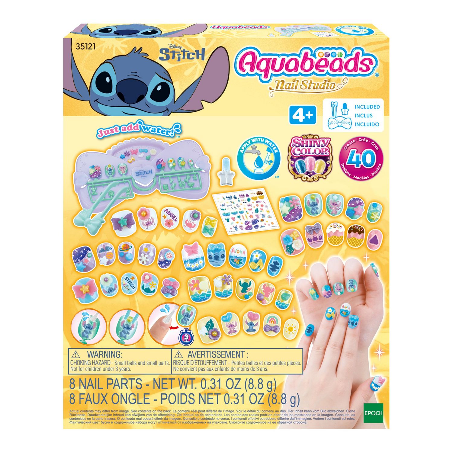 Aquabeads présente la gamme Nail Studio, les ongles qui collent avec de l’eau ! Embarque pour une aventure intergalactique avec Stitch et réalise une manucure aussi fun et colorée que lui grâce à ce kit. Choisis les ongles adaptés à ta taille, décore-les avec des autocollants inspirés de l'univers de Stitch. Ensuite, ajoute des petits accessoires selon tes envies en les faisant adhérer avec de l’eau : ils colleront comme par magie ! Puis, pose un peu d’eau sur ton ongle, place l’ongle Aquabeads que tu as préparé, fais sécher pendant 3 minutes… la magie opère de nouveau ! Change ta manucure à l’infini, selon tes envies, et en toute sécurité !