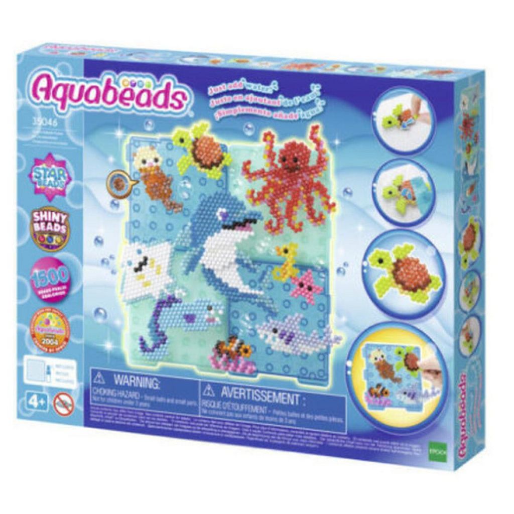 Avec ce coffret, la magie du monde marin va prendre vie ! Ce coffret inclus 4 bases de créations, qui te permettrons d'exposer toutes tes créations une fois terminées. Tu obtiendra alors un joli tableau sous-marin pour décorer ta chambre !. Le principe est simple : assemble les perles, vaporise de l'eau, laisse sécher et c'est prêt ! Il suffit de clipser tes créations sur la base pour la décorer !. Ce coffret contient des perles de différentes formes, la base de création pour exposer tes créations et décorer ta chambre, ainsi que l'essentiel pour des heures de créativité avec Aquabeads !. Dès 4 ans.