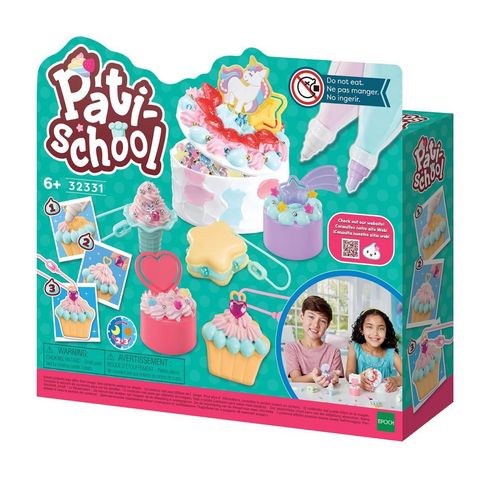 Pati-school est une activité de glaçage et de décoration. Les bases de création et les pâtes modelables (qui ne se mangent pas !) permettent aux enfants de devenir de véritables artistes ! Il suffit de glacer, de décorer et de laisser sécher à l'air libre pendant deux à trois jours, le temps que la pâte modelable durcisse. Cela donnera ensuite une jolie création à porter, utiliser en décoration, ou offrir à ses amis ! L'atelier de création est un coffret complet qui comporte 6 bases de création et 2 poches à douilles remplies de pâtes modelables rose et bleue. Une fois réalisées, les créations peuvent être utilisées comme boite à bijoux, porte-clés et porte-photos !