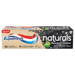 Spécifiquement conçu par des professionnels de la santé bucco dentaire et associés à notre expertise scientifique, Aquafresh Naturals contient 97 % d'ingrédients d'origine naturelle, pour vous offrir notre promesse de triple protection pour des dents propres, des gencives saines* et une haleine fraîche. Polit. Remineralise. Nettoie. Aquafresh Blancheur Charbon contient un mélange unique et rafraîchissant de menthes 100 % d'origine naturelle, notamment la menthe poivrée et la menthe verte ; des saveurs 100% naturelles. Dentifrice riche et strié de noir contenant du charbon actif qui agit en polissant les taches dentaires pour un sourire éclatant. Les minéraux actifs sont absorbés par vos dents pour renforcer et aider à protéger l'émail des dents Et notre emballage ? Cette boîte est conçue en carton recyclé, et elle est recyclable. Le tube ainsi que le carton peuvent également être entièrement recyclés.