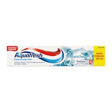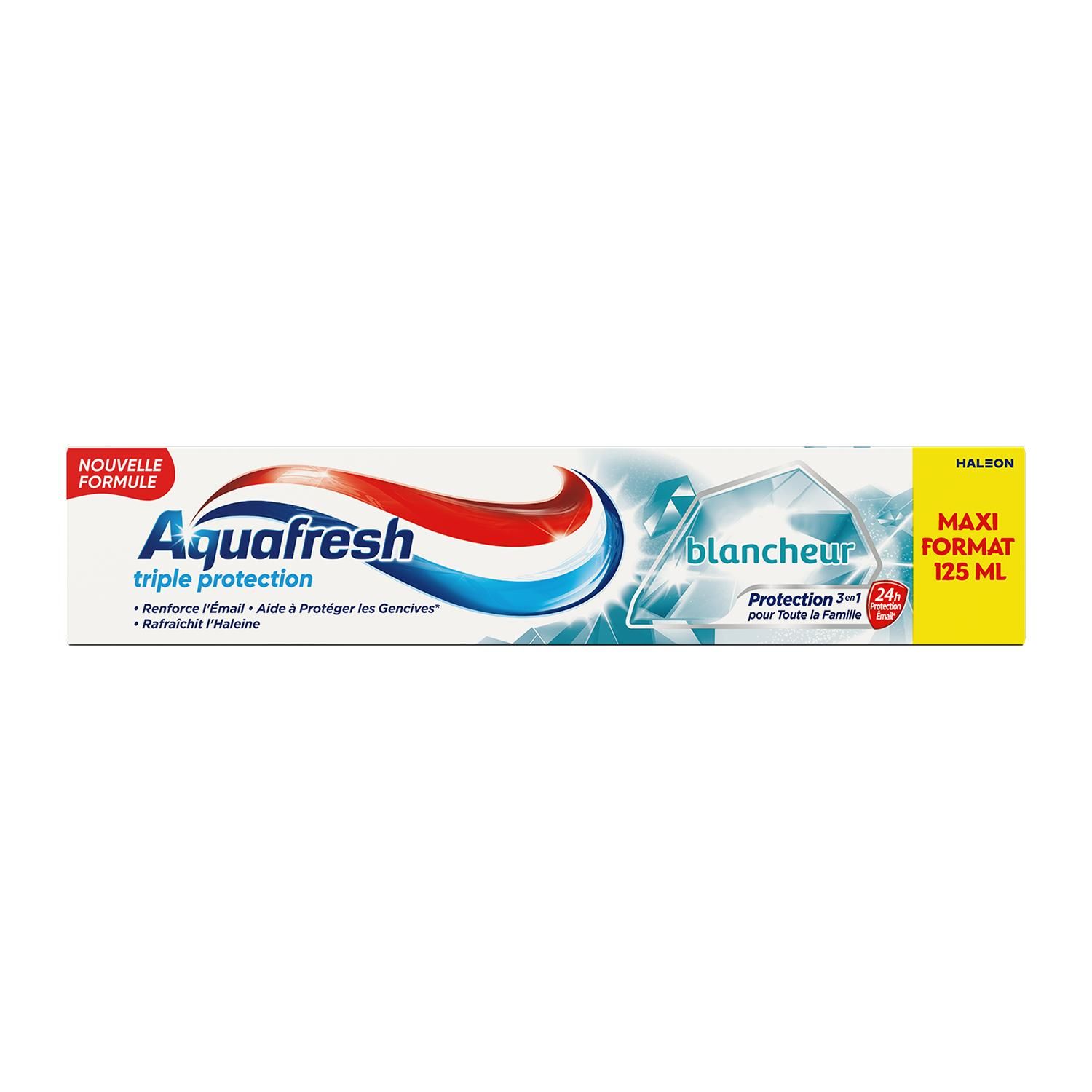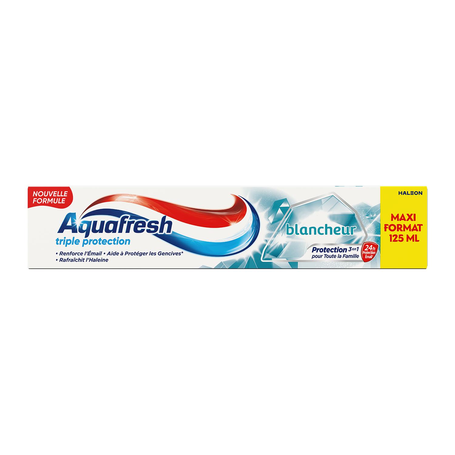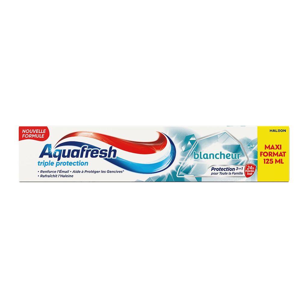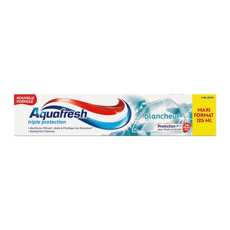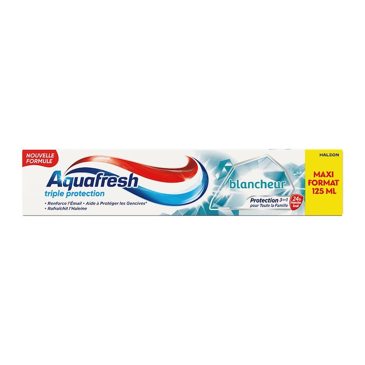 Aquafresh Triple Protection est une formule cliniquement prouvée qui offre une protection 3 en 1 pour toute la famille : renforce l'émail, il crée une barrière protectrice+ pour aider à protéger les dents ; aide à protéger les gencives* ; et rafraîchit l'haleine. Lors du brossage, les minéraux actifs sont absorbés par les dents pour renforcer et fortifier l'émail. Il crée une barrière protectrice+ pour aider à lutter tout au long de la journée*, contre les attaques acides des sucres. Lors du brossage, nos micro-particules nettoyantes lissent vos dents en douceur, les aidant ainsi à retrouver leur blancheur naturelle. • Renforce l'Émail • Aide à Protéger les Gencives* • Rafraîchit l'Haleine *Avec un brossage deux fois par jour. +Protection grâce au fluor, avec un brossage deux fois par jour.