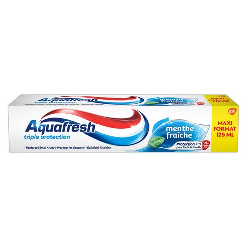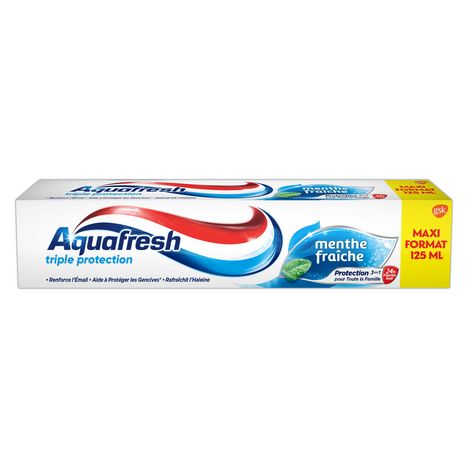 Aquafresh Triple Protection Menthe Fraîche est un dentifrice cliniquement prouvé pour offrir une protection 3 en 1 pour toute la famille. Il renforce l'émail en créant une barrière protectrice+ pour aider à protéger les dents, il aide à protéger les gencives* et il rafraîchit l'haleine. Lors du brossage, les minéraux actifs sont absorbés par les dents pour renforcer et fortifier l'émail. Il crée une barrière protectrice+ pour aider à lutter tout au long de la journée*, contre les attaques acides des sucres. *Avec un brossage deux fois par jour. +Protection grâce au fluor, avec un brossage deux fois par jour.