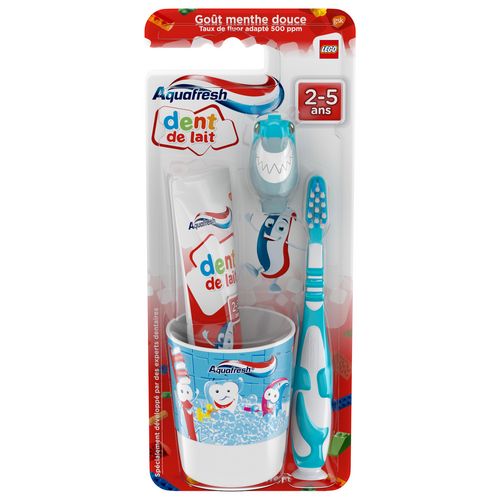 Le kit de brossage Aquafresh dent de lait comprend un gobelet, une brosse à dents avec son capuchon protecteur et un dentifrice. Il a été conçu pour encourager les enfants âgés de 3 à 5 ans à bien se brosser les dents.