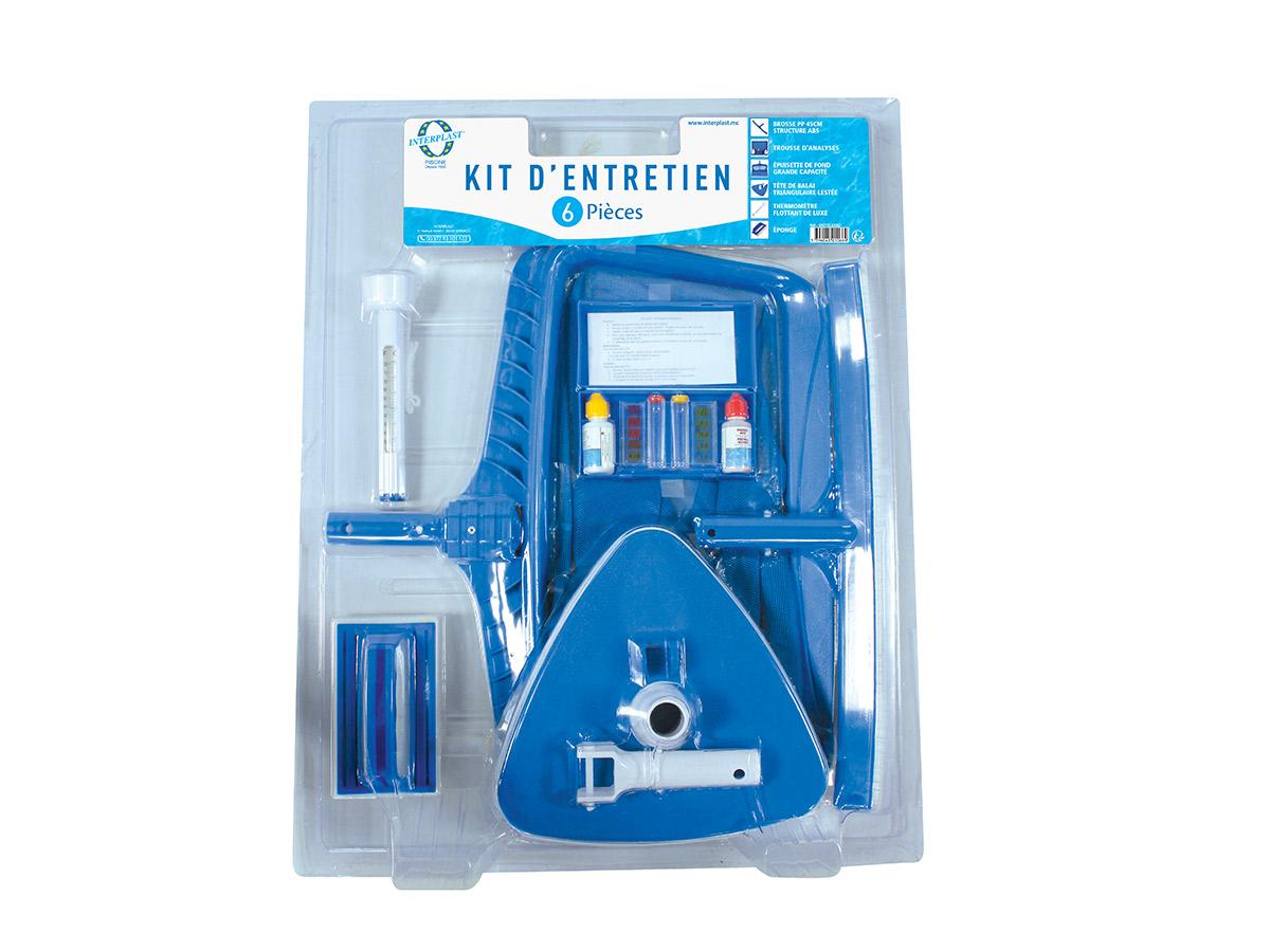 Kit entretien et de nettoyage pour piscine 6 piècesKit d'entretien et de nettoyage avec l'essentiel pour entretenir votre piscine. Ce kit pour piscine comprend : Brosse PP45 en structure ABSÉpuisette de fond de grande capacitéTête de balai triangulaire lestéeKit d'analysesThermomètre flottant de lux