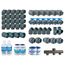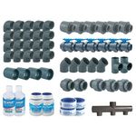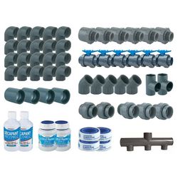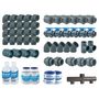 Composition du kit de plomberie pour piscine 10 x 5 m :1 Collecteur d'aspiration 3 entrées/1 sortie avec 2 bouchons d'extrémité Ø 50 mm6 Vannes à coller Ø 50 mm (femelle à coller, siège de bille réglable double union, poignée bleue)2 Embouts mixte 50 × 63 × 2 mm (femelle-mâle à coller / mâle fileté)