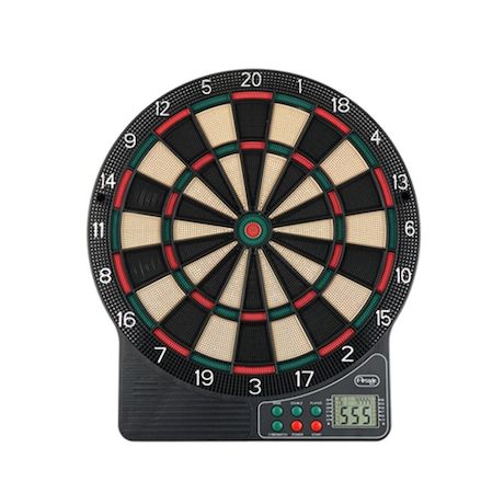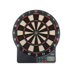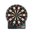 . 21 jeux avec 65 niveaux de variation. Jusqu'à 8 joueurs avec affichage indépendant. Ecran de score LCD. Tableau de score dédié pour le cricket. Mode Cybermatch : 5 niveaux d'adversaires informatisés. Effets sonores et annonces vocale. Large anneau périphérique. Livré avec : 6 fléchettes pointes plastiques, 1 lot de 24 pointes plastiques, notice d'utilisation. Fonctionne sur secteur (adaptateur inclus) ou avec 3 piles AA (non fournies). Dimensions : 45x40x2,5 cm