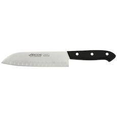 - Couteau Santoku alvéolé 17 cm- Bolonia- Des couteaux de cuisine performants pour des cuisiniers amateurs ou passionnés exigeants !- Lame en acier inox NITRUM® pour des performances de coupe exceptionnelles- L'acier Nitrum® est un acier exclusif enrichi au nitrogène et développé par ARCOS- Cet acier supporte parfaitement l'affà»tage et est très apprécié des utilisateurs pour un usage intensif- Sa structure moléculaire et da dureté (57/58 HRC) permettent une coupe et une tenue de coupe dans le temps supérieures de 40 % par rapport aux aciers altiques- Sa structure, sa forte teneur en chrome et son polissage soigné permettent d'éviter les risques de corrosion- Angle de 25° pour le fil des lames pour une coupe précise et nette (la moyenne habituelle utilisée en coutellerie est de 35/40°)- Lame pleine soie pour plus d'équilibre et de robustesse- Lame alvéolée : les aliments découpés ne collent pas à la lame- Manche en plastique POM (plastique haut de gamme résistant aux rayures, aux chocs) avec 3 rivets inox- Nettoyage facile : passe au lave-vaisselle- Garantie 10 ans- Fabriqué en Espagne.