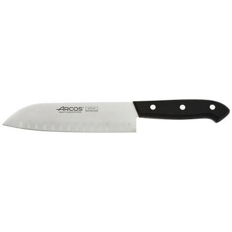 Arcos 865640 Couteau Santoku alvéolé 17 cm - Bolonia - Des couteaux de cuisine performants pour des cuisiniers amateurs ou passionnés exigeants ! - Lame en acier inox NITRUM® pour des performances de coupe exceptionnelles - L'acier Nitrum® est un acier exclusif enrichi au nitrogène et développé par ARCOS - Cet acier supporte parfaitement l'affûtage et est très apprécié des utilisateurs pour un usage intensif - Sa structure moléculaire et da dureté (57/58 HRC) permettent une coupe et une tenue de coupe dans le temps supérieures de 40 % par rapport aux aciers altiques - Sa structure. sa forte teneur en chrome et son polissage soigné permettent d'éviter les risques de corrosion - Angle de 25° pour le fil des lames pour une coupe précise et nette (la moyenne habituelle utilisée en coutellerie est de 35/40°) - Lame pleine soie pour plus d'équilibre et de robustesse - Lame alvéolée : les aliments découpés ne collent pas à la lame - Manche en plastique POM (plastique haut de gamme résistant aux rayures. aux chocs) avec 3 rivets inox - Nettoyage facile : passe au lave-vaisselle - Garantie 10 ans - Fabriqué en Espagne.
