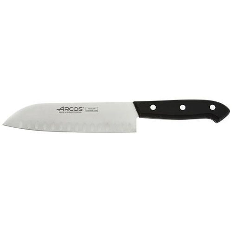 Arcos 865640 Couteau Santoku alvéolé 17 cm - Bolonia - Des couteaux de cuisine performants pour des cuisiniers amateurs ou passionnés exigeants ! - Lame en acier inox NITRUM® pour des performances de coupe exceptionnelles - L'acier Nitrum® est un acier exclusif enrichi au nitrogène et développé par