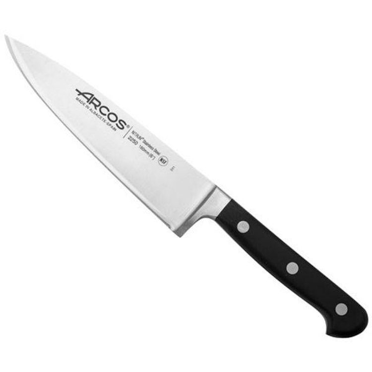 Couteau Chef 16 cm - Opera - Des couteaux 100 % forgé au service d'une découpe parfaite ! - Cette gamme est 100 % forgée : contrairement aux couteaux altiques ''plats'', la partie métallique d'un couteau forgé a été chauffée puis mise en forme pour permettre la présence d'une mitre entre la lame et la soie d'un couteau (la soie est la partie de la lame entrant dans le manche) - La mitre apporte poids, équilibre et robustesse au couteau - Véritable couteau forgé, ce couteau se compose d'une seule et unique pièce d'acier - Le couteau CHEF possède une lame large et forte avec un fil lisse : c'est un couteau multi-usages permettant d'émincer et de découper - Lame en acier inox NITRUM pour des performances de coupe exceptionnelles - L'acier Nitrum est un acier exclusif enrichi au nitrogène et développé par ARCOS - Cet acier supporte parfaitement l'affûtage et est très apprécié des utilisateurs pour un usage intensif - Sa structure moléculaire et da dureté (57/58 HRC) permettent une coupe et une tenue de coupe dans le temps supérieures de 40 % par rapport aux aciers altiques - Nouveau fil de lame Silk Edge : angle extra-fin de 24° pour une coupe rasoir précise et nette (la moyenne habituelle utilisée en coutellerie est de 35/40°) - Lame pleine soie pour plus d'équilibre et de robustesse - Manche en plastique POM (plastique haut de gamme résistant aux rayures, aux chocs) avec 3 rivets inox - La soie est chauffée avant la pose des plaquettes POM afin de permettre une légère fonte de celles-ci et de garantir une étanchéité parfaite - Nettoyage facile : passe au lave-vaisselle