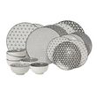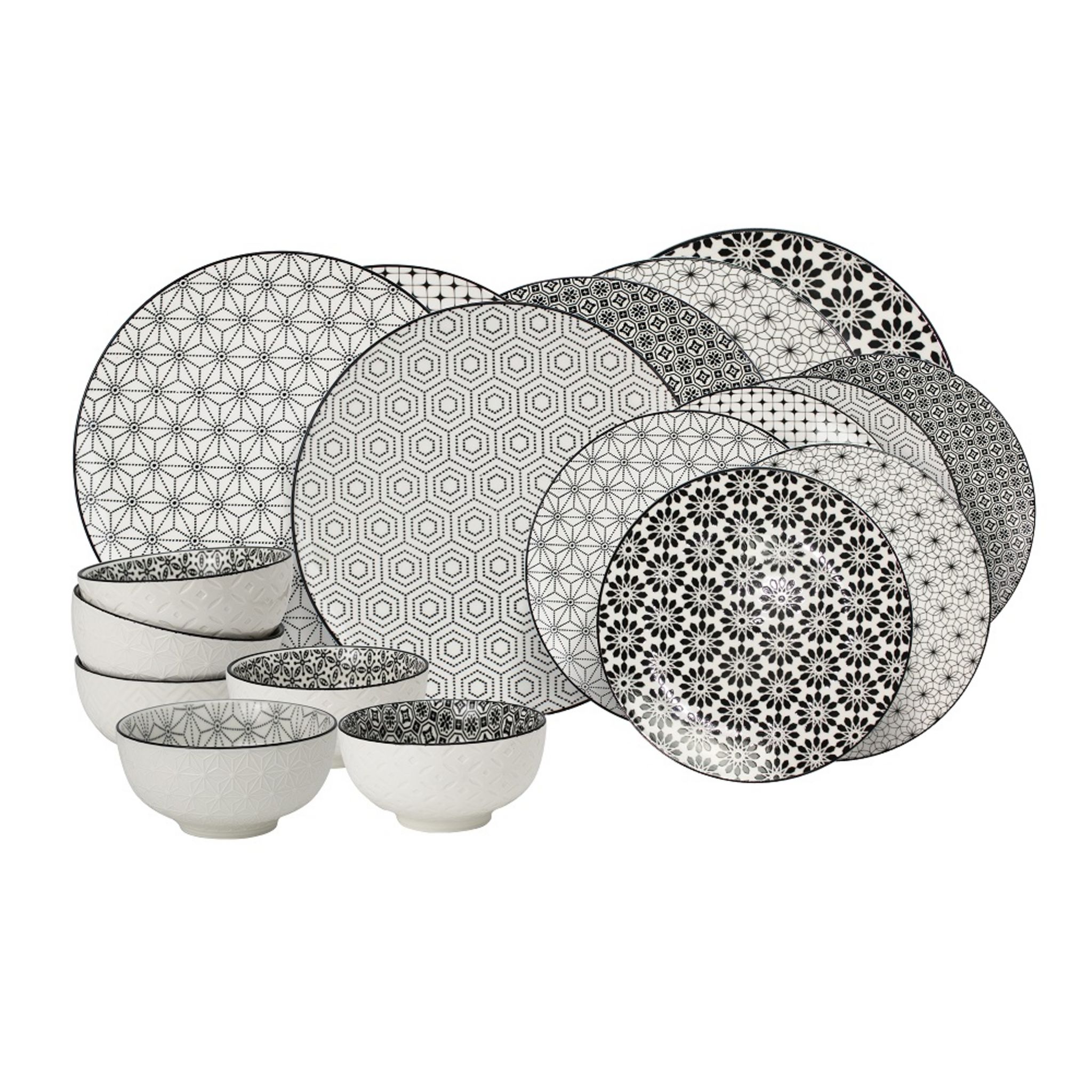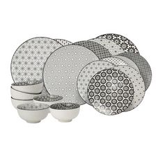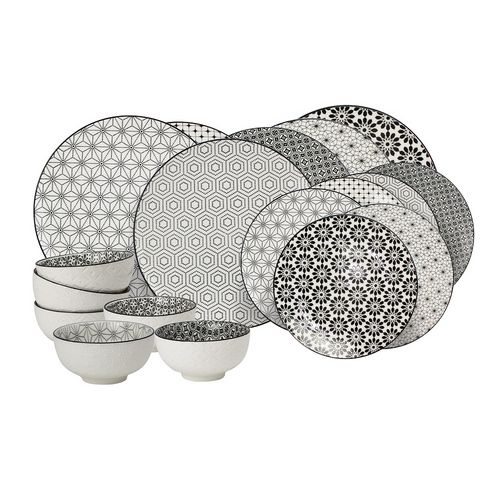 Service d'assiettes et bols 18 pièces en porcelaine de la collection KOMAE. Ce set se compose de : - 6 Grandes Assiettes Komae design graphique diam 26,5 cm - 6 Assiettes à dessert Komae design graphique diam 21 cm - 6 Bols Komae design graphique diam 11 cm Ce lot comprend différents imprimés. Compositions : - grande assiette : 26,5cm x 2 cm - petite assiette : 21 cm x 2 cm - bol : 11 cm x 6 cm Compatible au lave vaisselle et au micro ondes.