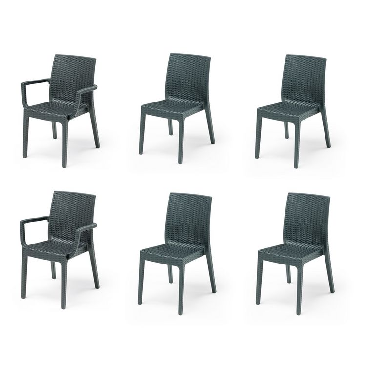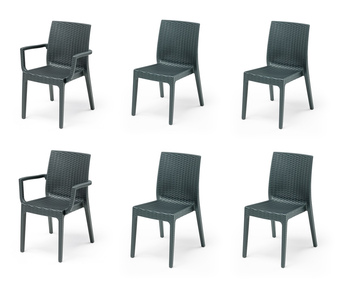 Ce lot est composé de 4 chaises SELENE et de 2 fauteuils DAFNE anthracite. Ces chaises et fauteuils de jardin sont conçus en résine imitation résine tressée pour apporter une touche d'élégance. Légères mais robustes, ces chaises et fauteuils de jardin s'utilisent aussi bien en intérieur qu'en extérieur pour un usage collective ou domestique. A associer avec la table de jardin LIPARI gris anthracite pour obtenir un salon de jardin fonctionnel et élégant !