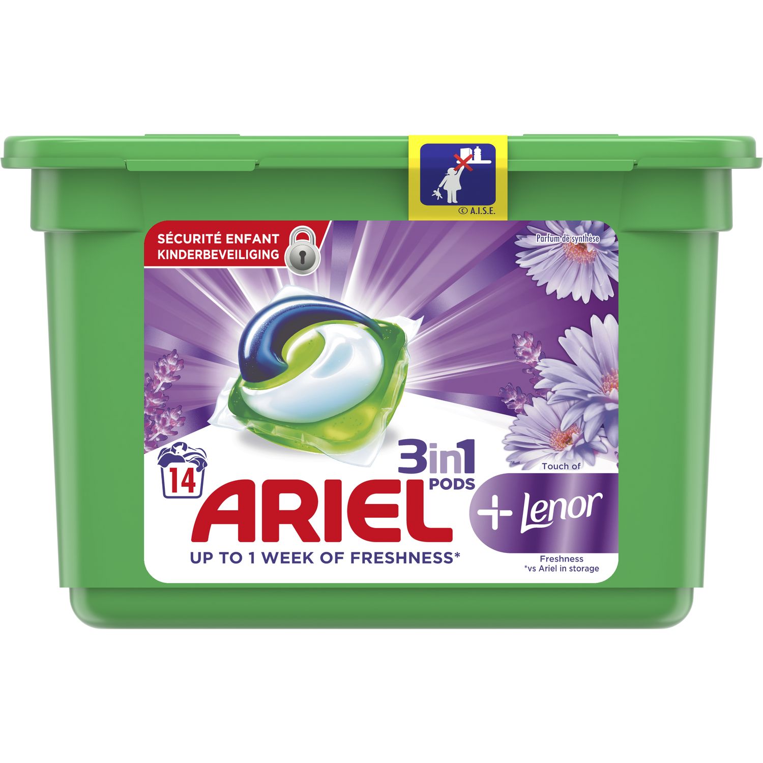 Ariel Touch Of Lenor, Lessive En Capsules, 14 Lavages Les capsules Ariel 3en1 Pods + Touch Of Lenor procurent la propreté exceptionnelle d’Ariel et une dose de fraîcheur florale grâce à Lenor. Elles contiennent des technologies uniques qui ne se contentent pas de masquer les odeurs, mais les éliminent à la source et les remplacent par un parfum frais et durable. Le design unique à plusieurs compartiments de la lessive en capsules ultra-concentrée Ariel 3en1 Pods + Touch Of Lenor permet de garder les ingrédients stables et séparés jusqu’à ce qu’ils entrent en contact avec l’eau. Le film innovant de la lessive en capsules Ariel se dissout complètement au contact de l’eau et libère des technologies puissantes, qui viennent à bout d’un grand nombre de taches et d’odeurs, avec la quantité idéale de lessive pré-dosée. À utiliser avec le parfum de linge Unstoppables Active, pour encore plus de fraîcheur. ATTENTION : Ce produit peut être nocif et peut provoquer de graves blessures. Tenir les capsules Ariel hors de portée des enfants. Pour plus d’informations, consulter le site www.keepcapsfromkids.eu.