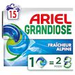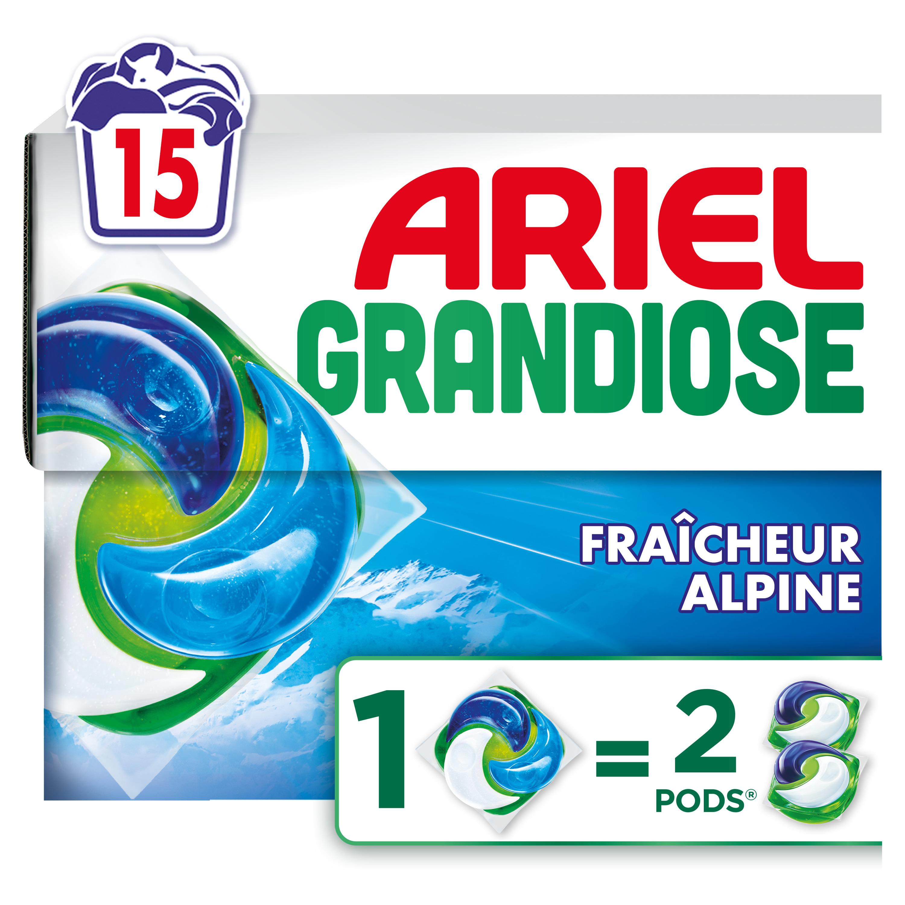 Découvrez la lessive en capsules Ariel Grandiose PODS Fraîcheur Alpine, avec 2 X action détachante et anti-odeur (la performance d'Ariel Grandiose est égale à 2 Ariel Original 3en1 PODS). Ces capsules vous offriront une propreté Ariel maximale pour un minimum d'effort : dites adieu au re-lavage, même pour les grosses lessives et les taches tenaces. Les capsules Ariel Grandiose PODS sont également fabriquées en France. De plus, elles ont été conçues pour une performance optimale même à basse température, elles se dissolvent rapidement même à froid et offrent des résultats impeccables. Lavez plus froid et économisez jusqu'à 60 % sur la facture d'électricité de votre machine à laver (consommation d'énergie de la machine à laver, de 60 °C à 30 °C, cycle normal). Pour de meilleurs résultats, placez la pod en premier à l'arrière du tambour, les vêtements par dessus. Gardez toujours la lessive Ariel Grandiose PODS hors de portée des enfants. Consultez keepcapsfromkids.eu pour en savoir plus.