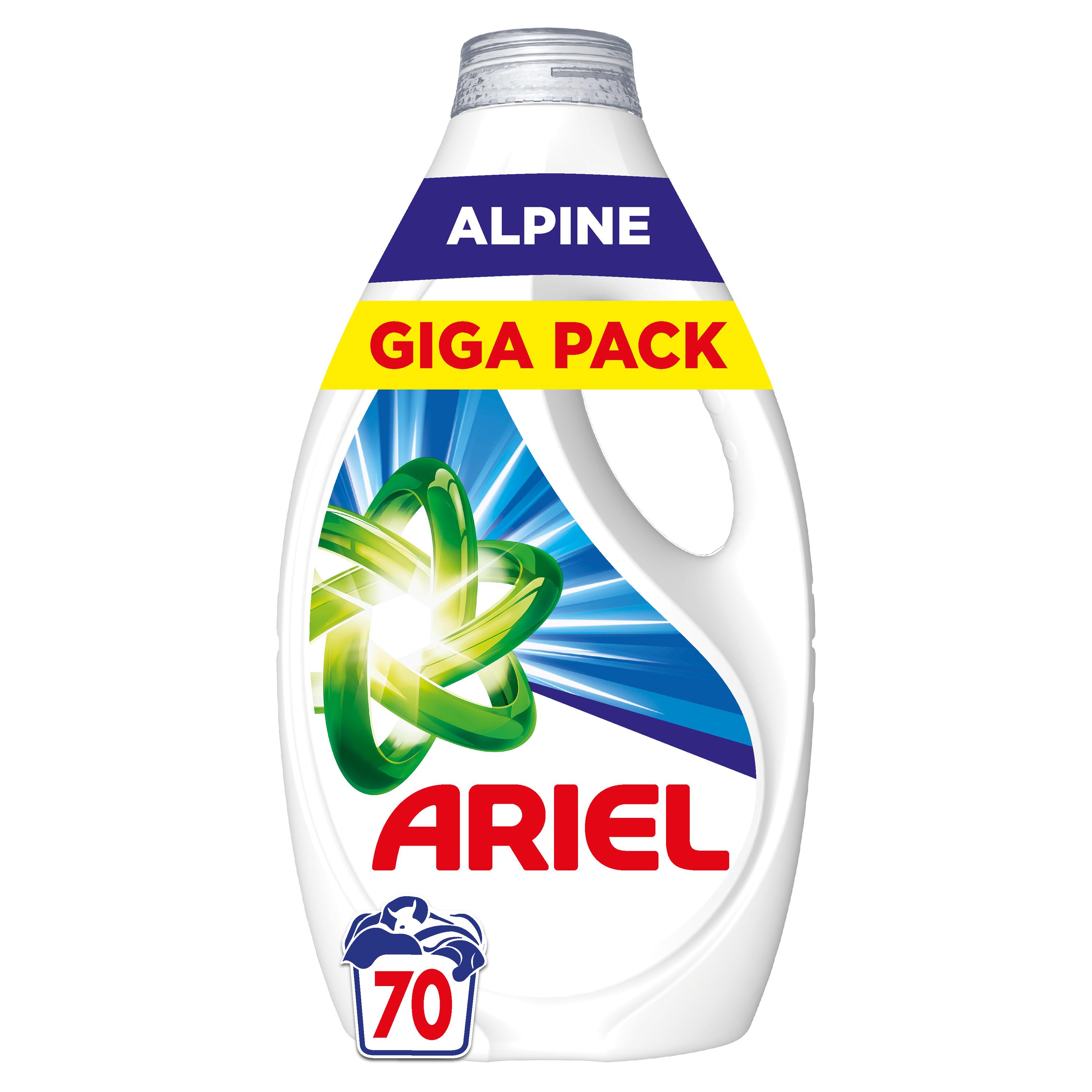 La lessive liquide Ariel Alpine a une action détachante en un seul lavage. De plus, elle est fabriquée en France. Vous pouvez aussi utiliser la lessive liquide Ariel Alpine pour prétraiter les taches à l'aide du bouchon vert, puis placer vos vêtements dans votre lave-linge. Pour de meilleurs résultats, remplissez le bouchon vert de lessive liquide Ariel jusqu'au niveau de remplissage du tambour et placez-le dans le tambour, sur les vêtements. Pour des raisons environnementales, les bouteilles ne sont pas toutes fournies avec un bouchon. Celui-ci est disponible gratuitement sur ariel.info.