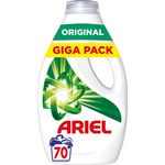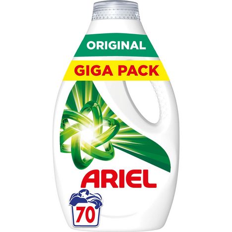 La lessive liquide Ariel Original offre des résultats impeccables même en cycle court et à froid. Sa formule a été spécialement conçue pour le lavage à froid. Lavez à froid avec la lessive liquide Ariel : faites des économies d'énergie à chaque lavage et réduisez les émissions de CO₂ de vos lessives. La lessive liquide Ariel est également fabriquée en France. De plus, le corps et les bouchons de la bouteille de lessive liquide Ariel sont recyclables et la bouteille est fabriquée à partir de 50 % de plastique recyclé (hors l'étiquette). Vous pouvez aussi utiliser la lessive liquide Ariel Original pour prétraiter les taches avec le bouchon vert, puis placer vos vêtements dans votre lave-linge. Pour de meilleurs résultats, mettre le bouchon de dosage avec la lessive dans le tambour de la machine. Pour des raisons environnementales, les bouteilles ne sont pas toutes fournies avec un bouchon. Il est disponible gratuitement sur le site ariel.info.