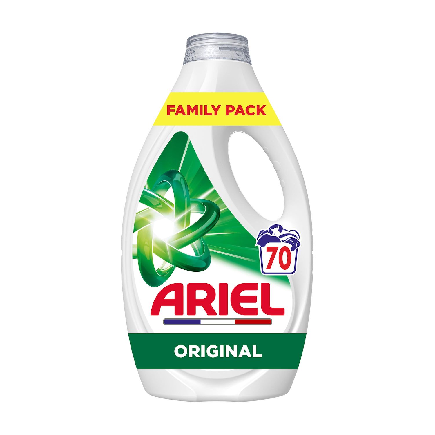 Le détergent liquide Ariel Original pour la lessive offre un détachage impeccable même lors des cycles froids et courts. Laver à froid permet d'économiser jusqu'à 60 % d'énergie à chaque lavage (consommation d'énergie de la machine à laver, de 60°C à 30°C, cycle normal) et d'aider à préserver vos tissus plus longtemps. Le détergent liquide Ariel est également fabriqué en France. Pour les taches tenaces, vous pouvez utiliser le détergent liquide Ariel pour prétraiter les taches avec le bouchon doseur transparent, puis placer vos vêtements dans votre machine à laver. Pour le dosage, remplissez le bouchon avec le liquide de lavage Ariel selon le niveau de remplissage du tambour et placez-le dans le tambour, sur les vêtements pour obtenir les meilleurs résultats de lessive. Pour des raisons environnementales, toutes les bouteilles ne sont pas équipées d'un bouchon doseur, il est disponible gratuitement sur ariel.info.
