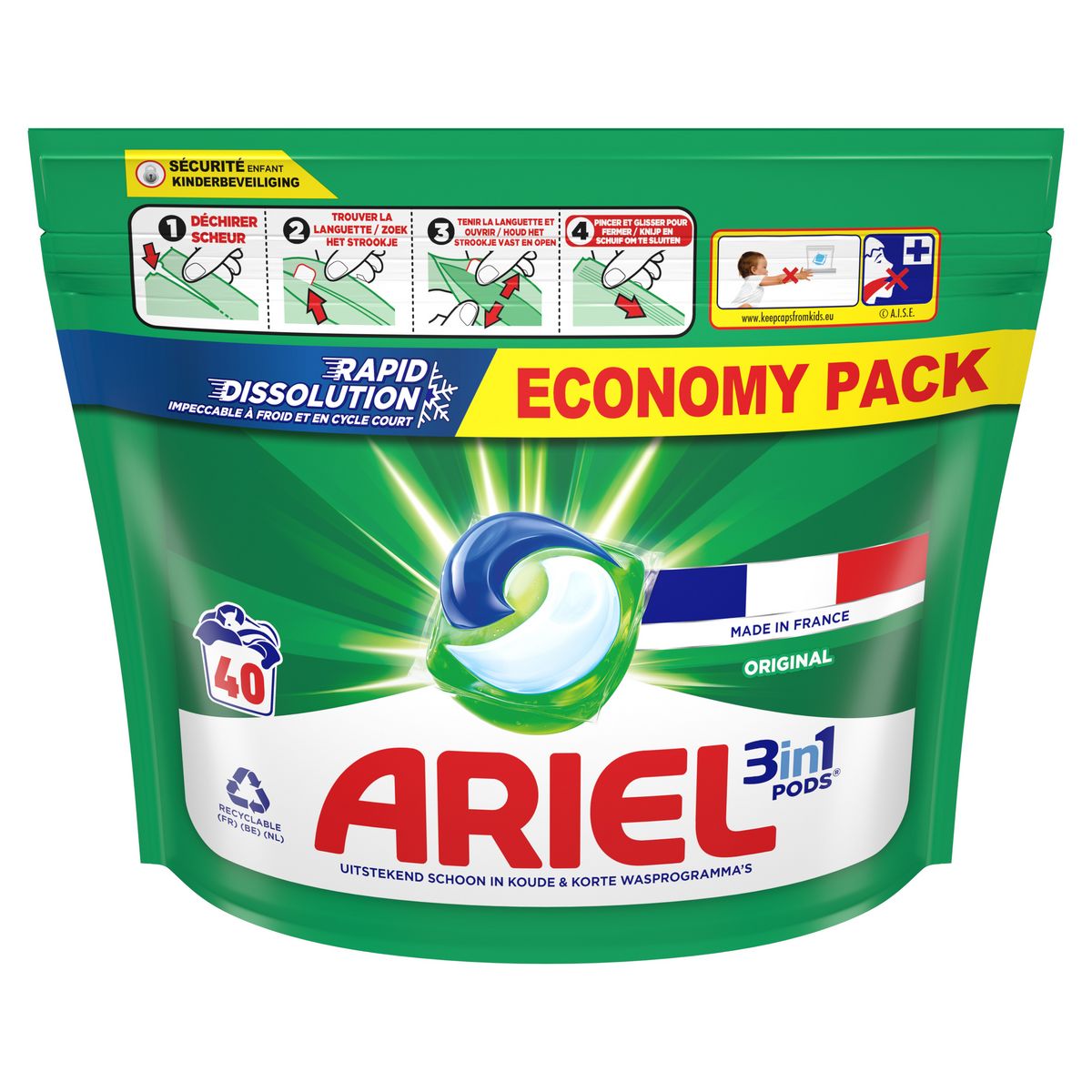 La lessive en capsules Ariel 3en1 PODS Original se dissout rapidement, même à l'eau froide, pour des résultats impeccables à froid et en cycle court. Lavez à froid avec Ariel PODS : laver à basse température permet d'économiser de l'électricité et donc de réduire le CO₂. Cela protège aussi votre linge plus longtemps (par rapport aux cycles à chaud). Les capsules Ariel PODS sont également fabriquées en France. Au contact de l'eau, le film des Pods 100 % soluble se dissout complètement pour libérer des technologies puissantes d'élimination des taches, offrant le nettoyage efficace et en profondeur d'Ariel 3en1 PODS Original. De plus, la lessive en capsules Ariel est dans un emballage recyclable. Avertissement : ce produit peut être nocif et peut provoquer des blessures graves. Toujours conserver la lessive en capsules Ariel 3in1 PODS hors de portée des enfants. Pour plus d'informations, consulter le site keepcapsfromkids.eu.