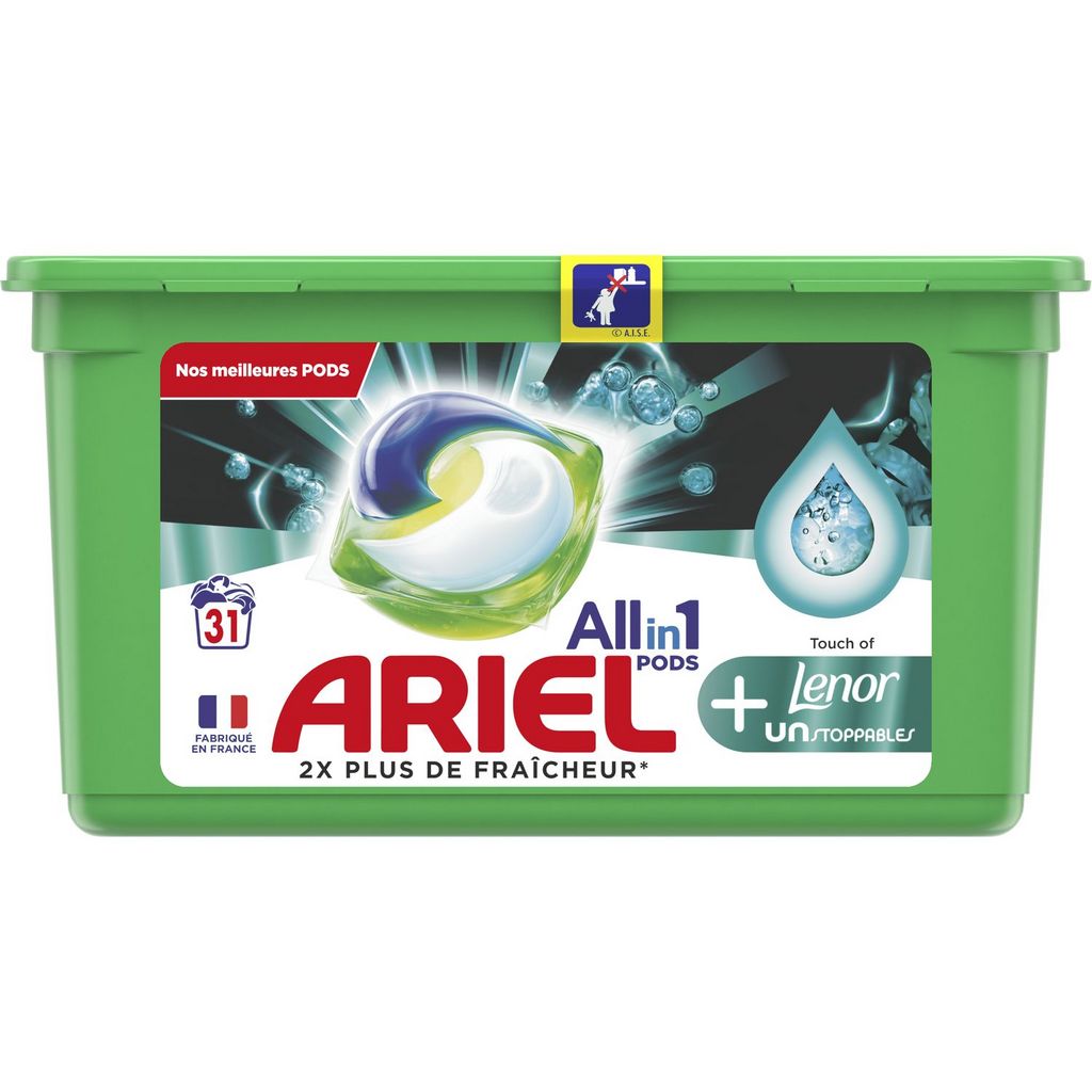 Une puissance de nettoyage extraordinaire concentrée dans une seule capsule. Le design unique à plusieurs compartiments de la lessive en capsules Ariel Allin1 Pods +Unstoppables permet de garder les ingrédients stables et séparés jusqu’à ce qu’ils entrent en contact avec l’eau, pour fournir une performance de lavage maximale grâce à une formule ultra concentrée. Le film innovant de la lessive en tablettes Ariel se dissout complètement au contact de l’eau et libère des technologies puissantes, qui viennent à bout d’un grand nombre de taches, avec la quantité idéale de la meilleure lessive liquide d’Ariel. À utiliser avec les adoucissants Lenor et le parfum de linge Unstoppables, pour une touche de fraîcheur et de douceur supplémentaire. ATTENTION : Ce produit peut être nocif et peut provoquer de graves blessures. Tenir les capsules Ariel hors de portée des enfants. Pour plus d’informations, consulter le site www.keepcapsfromkids.eu. Ariel Allin1 Pods +Unstoppables Lessive En Capsules 31 Lavages