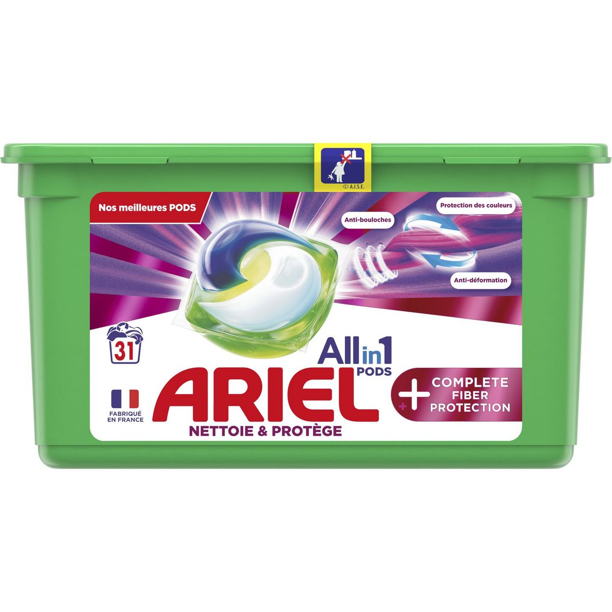 Une puissance de nettoyage extraordinaire concentrée dans une seule capsule. Le design unique à plusieurs compartiments de la lessive en capsules Ariel Allin1 Pods +Complete Fiber Protection permet de garder les ingrédients stables et séparés jusqu’à ce qu’ils entrent en contact avec l’eau, pour fournir une performance de lavage maximale grâce à une formule ultra concentrée. Le film innovant de la lessive en tablettes Ariel se dissout complètement au contact de l’eau et libère des technologies puissantes, qui viennent à bout d’un grand nombre de taches, avec la quantité idéale de la meilleure lessive liquide d’Ariel. À utiliser avec les adoucissants Lenor et le parfum de linge Unstoppables, pour une touche de fraîcheur et de douceur supplémentaire. ATTENTION : Ce produit peut être nocif et peut provoquer de graves blessures. Tenir les capsules Ariel hors de portée des enfants. Pour plus d’informations, consulter le site www.keepcapsfromkids.eu. Ariel Allin1 Pods +Complete Fiber Protection Lessive En Capsules 31 Lavages