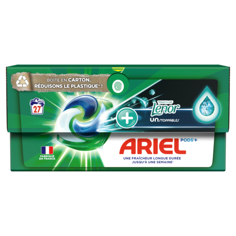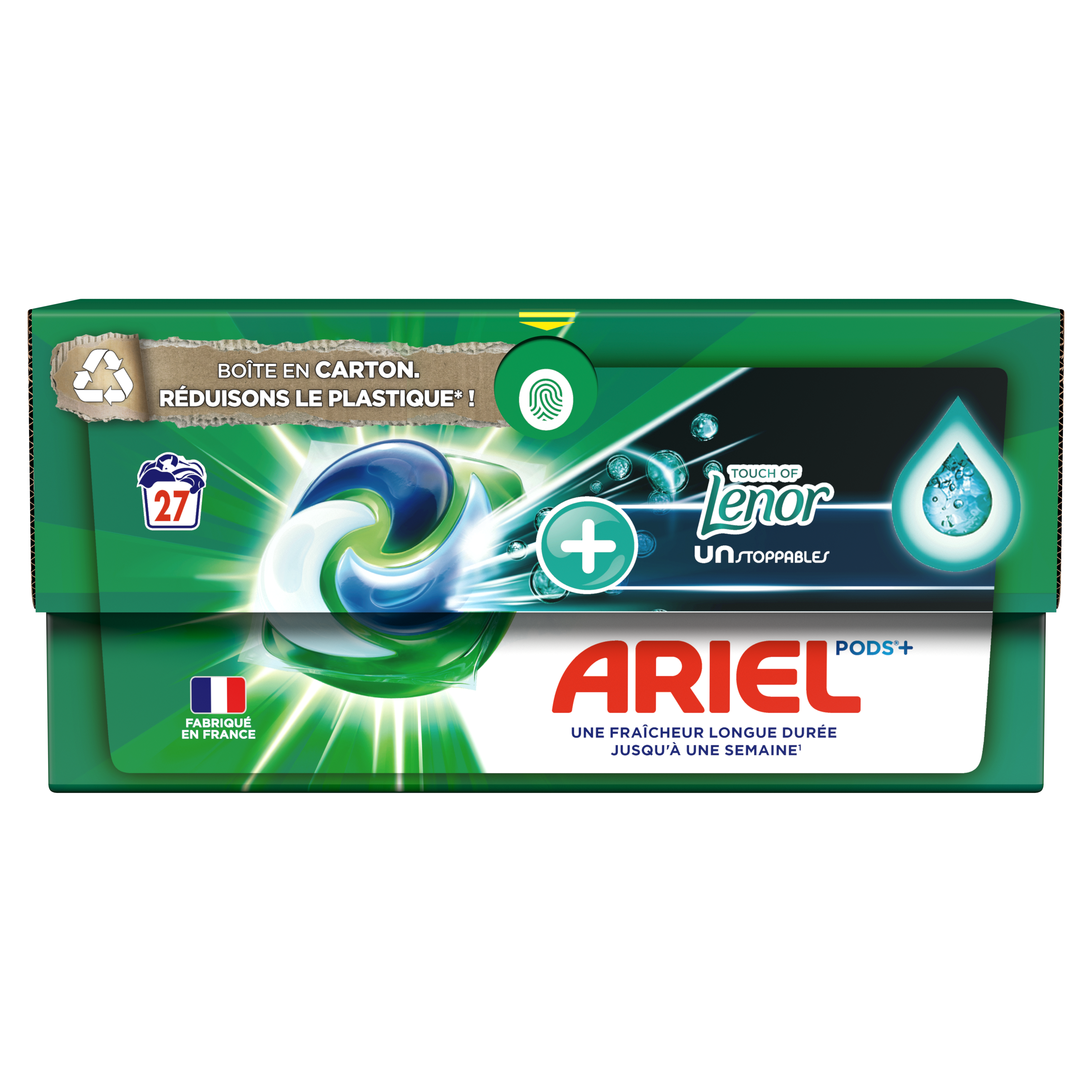 Découvrez la lessive liquide en capsules Ariel PODS +Unstoppables Touche de Lenor. Désormais fournie avec une recharge bleue supplémentaire, elle offre une fraîcheur durable jusqu’à une semaine (dans l’armoire). Fabriquée en France, elle est conçue pour être utilisée à froid avec la technologie COOL CLEAN unique. Au contact de l’eau, le film se dissout complètement pour libérer des technologies puissantes d’élimination des taches, offrant le nettoyage efficace et en profondeur d’Ariel PODS +Unstoppables Touche de Lenor. De plus, la lessive en tablettes Ariel contribue à réduire la production de plastique grâce à sa boîte en carton recyclable ÉCOCLIC. Elle est fabriquée à 70 % à partir de fibres recyclées et ne contient que 5 % de plastique maximum, pour préserver vos PODS