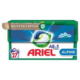 La lessive en capsules Ariel All-in-1 PODS Alpine est efficace même sur les taches tenaces dès le 1er lavage, même à basse température, et garantit une efficacité à 100 % (performance comparable par rapport à la formule précédente d'Ariel PODS Alpine). Elle a été conçue pour le lavage à froid, avec des technologies uniques comme la technologie Cool Clean. De plus, la lessive en tablettes Ariel contribue à réduire la production de plastique grâce à sa boîte en carton recyclable ÉCOCLIC ! Elle est fabriquée à 70 % à partir de fibres recyclées et ne contient que 5 % de plastique maximum, pour préserver vos PODS. La lessive en capsules d'Ariel est également fabriquée en France et produite à partir de 100 % d'électricité renouvelable achetée. Au contact de l'eau, le film des Pods 100 % hydrosoluble se dissout complètement pour libérer des technologies puissantes d'élimination des taches, offrant le pouvoir nettoyant All-in-1 Pods Alpine d'Ariel plus puissant et plus profond que jamais. Avertissement : Ce produit peut être nocif et peut provoquer de graves blessures. Toujours conserver la lessive en capsules Ariel All-in-1 PODS hors de portée des enfants. Pour plus d'informations, consulter le site keepcapsfromkids.eu.