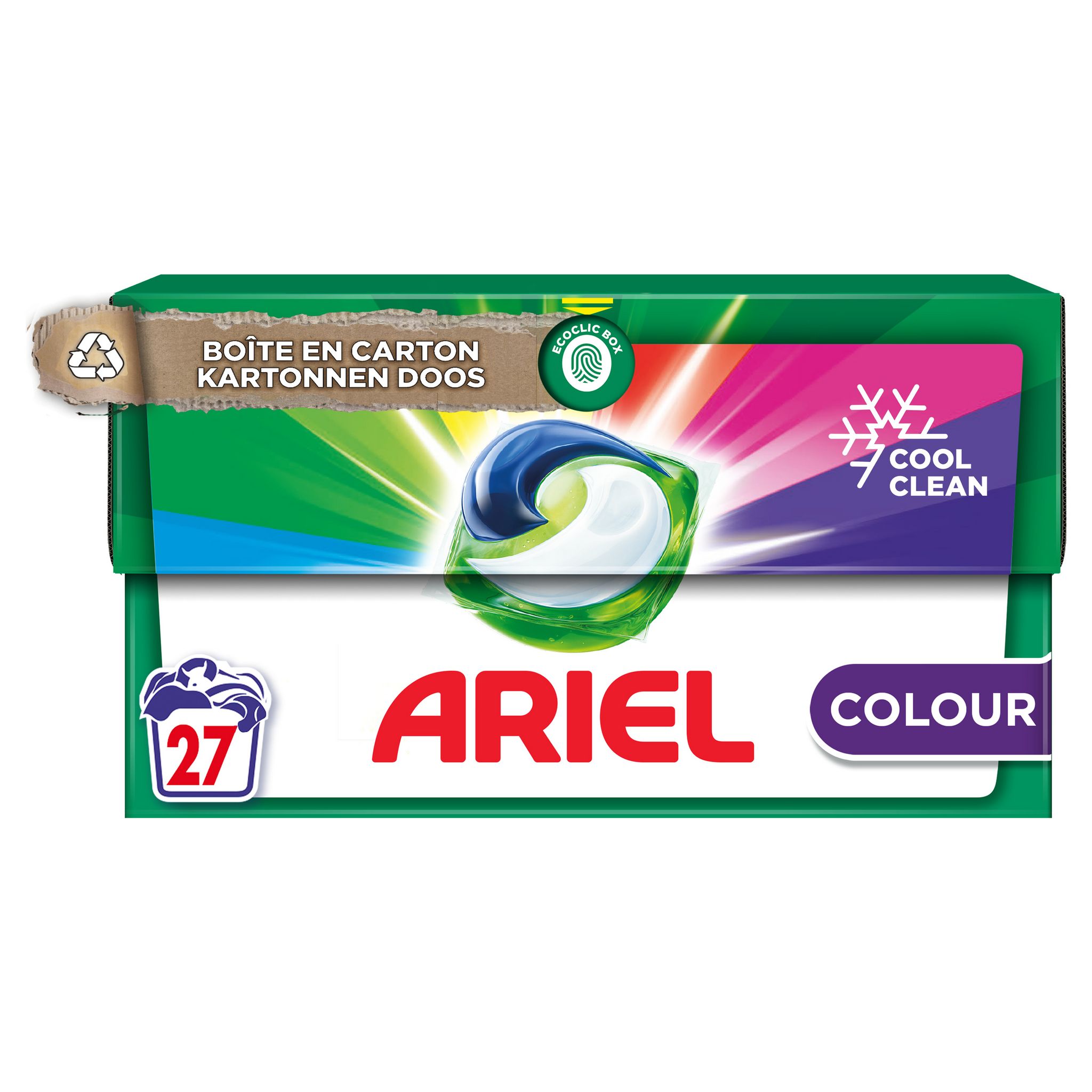 La lessive en tablettes Ariel All-in-1 PODS Couleur Clean & Fresh est efficace sur les taches tenaces dès le 1er lavage, même à basse température. Fabriquée en France, elle est conçue pour être utilisée à froid avec la technologie COOL CLEAN unique. Lavez à froid avec Ariel PODS : laver à basse température permet d'économiser de l'électricité et donc de réduire le CO₂. Cela protège aussi votre linge et la couleur plus longtemps (par rapport aux cycles à l'eau chaude). Au contact de l'eau, le film des Pods 100 % hydrosoluble se dissout complètement pour libérer des technologies puissantes d'élimination des taches, offrant le nettoyage efficace et en profondeur All-in-1 PODS Clean & Fresh Couleur d'Ariel. De plus, la lessive en tablettes Ariel contribue à réduire la production de plastique grâce à sa boîte en carton recyclable ÉCOCLIC. Elle est fabriquée à 70 % à partir de fibres recyclées et ne contient que 5 % de plastique maximum, pour préserver vos PODSAttention : Ce produit peut être nocif et peut provoquer de graves blessures. Toujours conserver la lessive en capsules Ariel All-in-1 Pods hors de portée des enfants. Pour plus d'informations, consulter le site keepcapsfromkids.eu