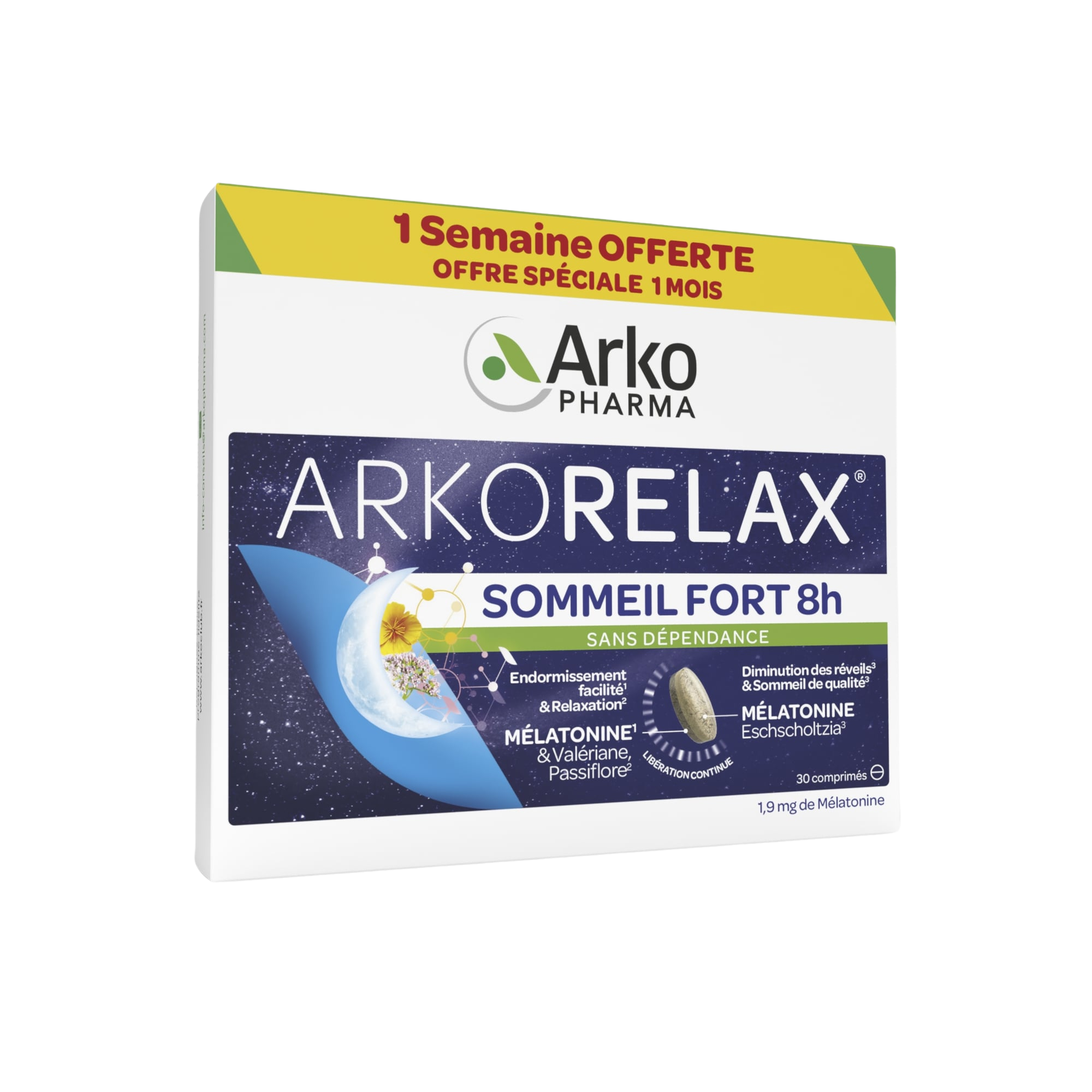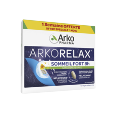 Chez Arkopharma, nous savons que les maux du quotidien peuvent être soulagés avec des produits de santé plus en affinité avec la physiologie naturelle du corps. Arkorelax® Sommeil Fort 8H est le 1er produit sommeil des laboratoires Arkopharma agissant selon les principes de la chronobiologie, en apportant de la mélatonine et des plantes en libération rapide et prolongée. Arkorelax® Sommeil Fort 8H délivre grâce à un comprimé bicouche innovant : 1. La 1ère couche à libération rapide contient 1 mg de Mélatonine qui favorise un endormissement plus rapide. La Passiflore et la Valériane facilitent votre détente, 2. La 2ème couche libère progressivement 0,9 mg de Mélatonine, de la Vitamine B6 et de l’Eschscholtzia. Cette plante aide à limiter les réveils nocturnes et à retrouver un sommeil réparateur et de qualité. Arkorelax® Sommeil Fort 8H ne provoque pas d'accoutumance ou de somnolence.