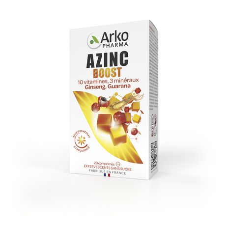 Le laboratoire Arkopharma, expert des vitamines pour chacun depuis plus de 30 ans, a développé AZINC BOOST. Cette formule, spécialement conçue pour améliorer les performances physiques et intellectuelles de manière immédiate et durable, associe 10 vitamines, 3 minéraux, 2 extraits de plantes et de la Caféine 100% d’origine végétale pour aider à : Procurer un effet « coup de fouet » immédiat lors des périodes d’activités intenses (examens, stress, surmenage, activités sportives, etc) et réduire la fatigue, grâce au Guarana et à la Caféine. Soutenir les performances intellectuelles grâce à la Vitamine B5 et maintenir le bon fonctionnement du système nerveux grâce aux Vitamines B2, B3, B6, B8 et B12. Retrouver énergie et vitalité de manière durable grâce au Ginseng et au Magnésium, et rester en forme grâce à la Vitamine C et au Zinc qui participent au bon fonctionnement du système immunitaire.