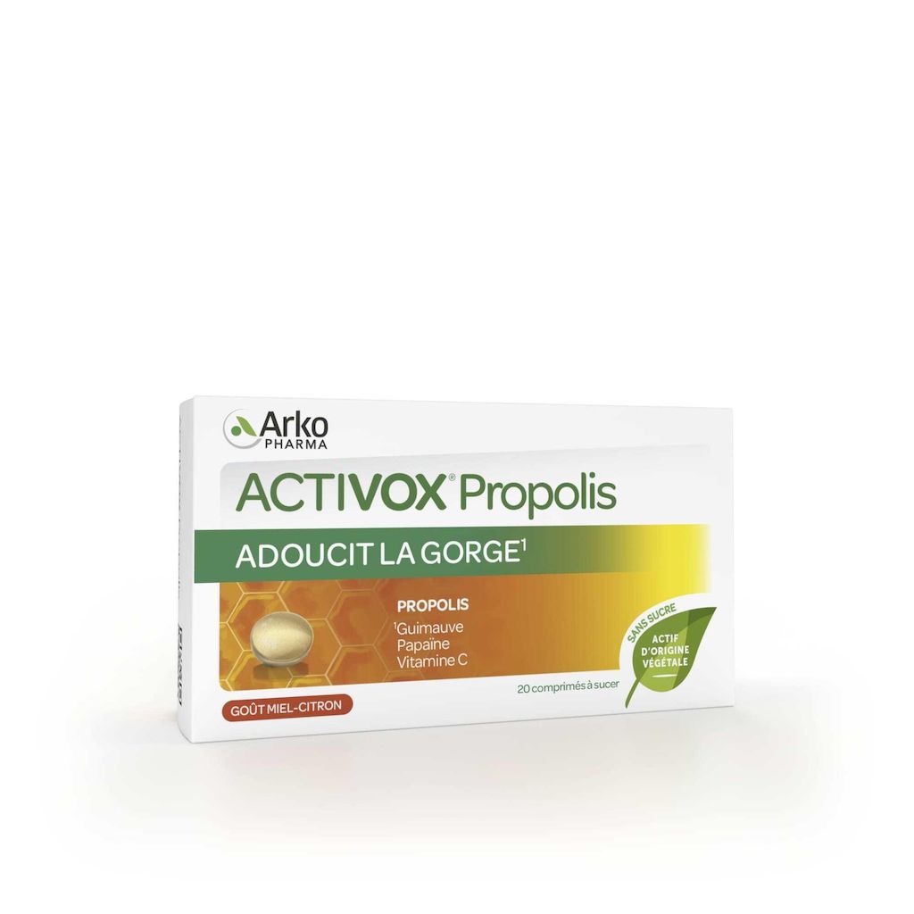 Pour plus de naturalité, les comprimés d'Activox Propolis sont formulés à partir d'un actif d'origine végétale, associé à la propolis, avec des arômes naturels et des additifs d'origine végétale. Ils sont sans sucre et sans gluten et ont un délicieux goût miel-citron.