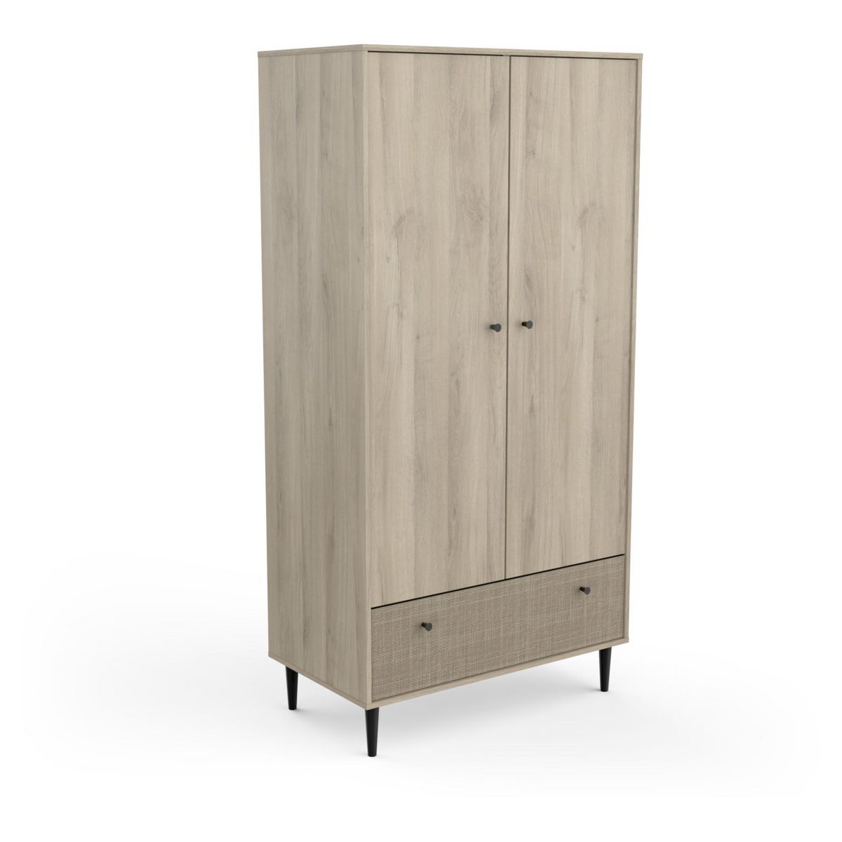 Armoire penderie avec un bel effet malgré une structure fragile : fonds du meuble, pieds plastique, ouverture portes et tiroirs...