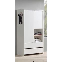 Armoire de la gamme Kiddy avec 2 portes et 2 tiroirs spacieux. Un complément idéal dans la chambre d'hôtes, enfant ou bébé, qui offre beaucoup d'espace. Le matériau du support est du MDF de haute qualité, peint en blanc. Tous les bords sont arrondis. Il y a une étagère et une tringle à vêtements derrière la porte gauche. Derrière la porte droite se trouve une étagère, comprenant deux compartiments ouverts. Ceux-ci ont une dimension intérieure d'environ L: 45 x H: 28 x P: 52 cm. L'étagère dans le compartiment ouvert a une finition en pin naturel. Tous les sols ne sont pas réglables. Il y a deux tiroirs spacieux ci-dessous. Les dimensions intérieures du tiroir sont d'environ L: 81 x H: 13 x P: 43 cm. La distance entre les tiroirs est telle que vous pouvez facilement ouvrir le tiroir en entrant. La garde au sol est d'environ 6 cm. La décoration n'est pas incluse dans la livraison. L'article est stable et de haute qualité. Les marchandises sont démontées pour un assemblage facile. Surface au sol environ: L: 90 x H: 180 x P: 55 cm.