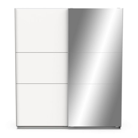 Armoire 2 portes coulissantes + miroir, en panneaux de particules 15 et 12mm. Décor papier blanc mat. Dans chaque colonne, 1 barre de penderie (charge maximale : 22kg) + 1 rayon (charge maximale : 14kg).