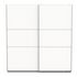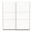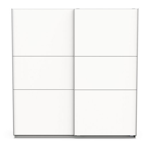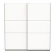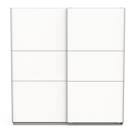 Armoire 2 portes coulissantes en panneaux de particules 15 et 12mm. Décor papier blanc mat. Dans chaque colonne, 1 barre de penderie (charge maximale : 24kg) + 1 rayon (charge maximale : 15kg).