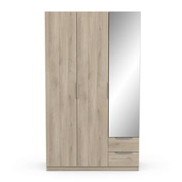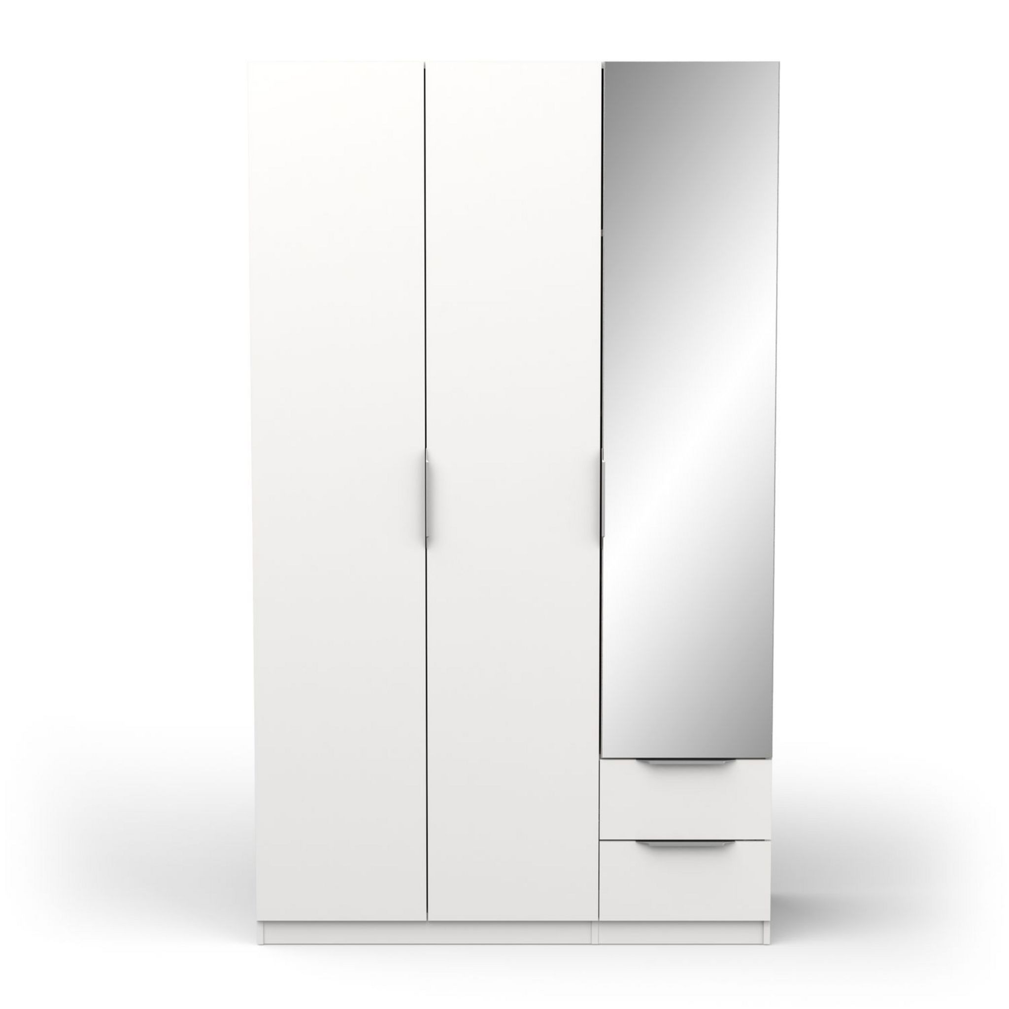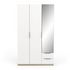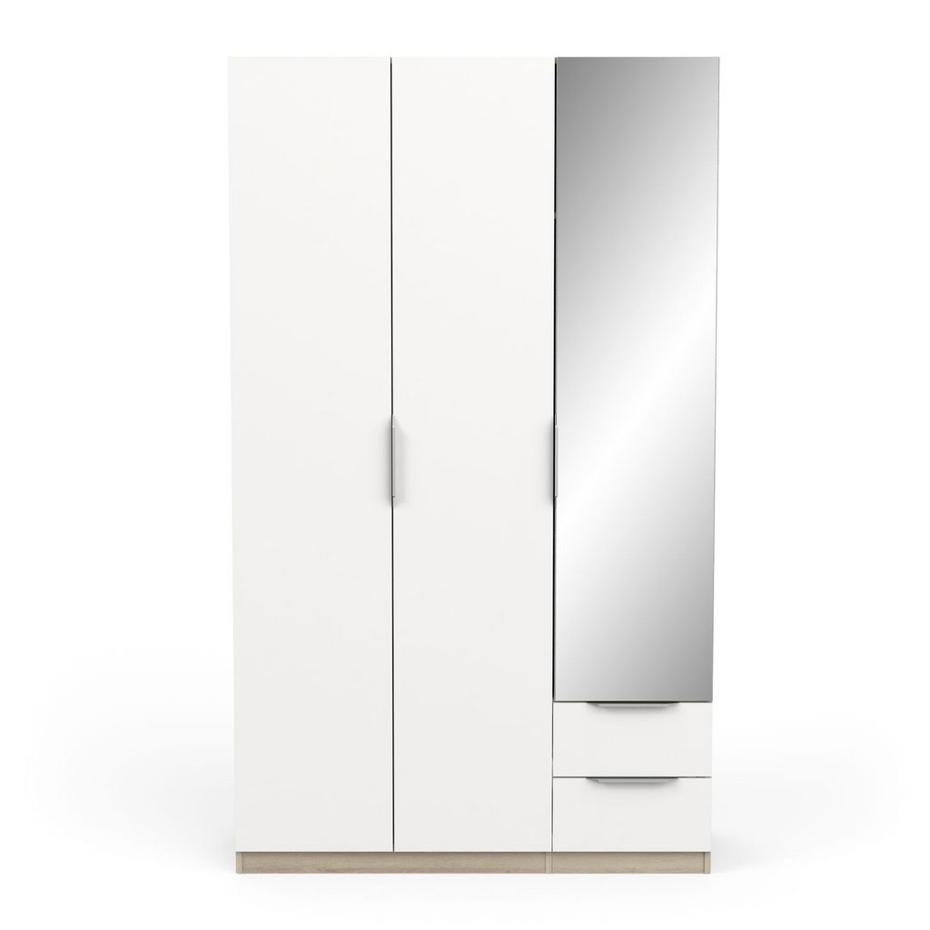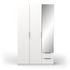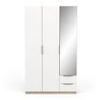 Armoire 3 portes + 2 tiroirs montés sur coulisses à billes + miroir, en panneaux de particules 12 et 15mm. Décor papier blanc mat. 1 barre de penderie, charge maximale : 19kg + 3 rayons dont 2 réglables sur 5 niveaux. Dimensions utiles des tiroirs : 35,2 x 38,7 x 10,6 cm ; charge maximale : 2kg.