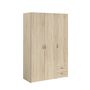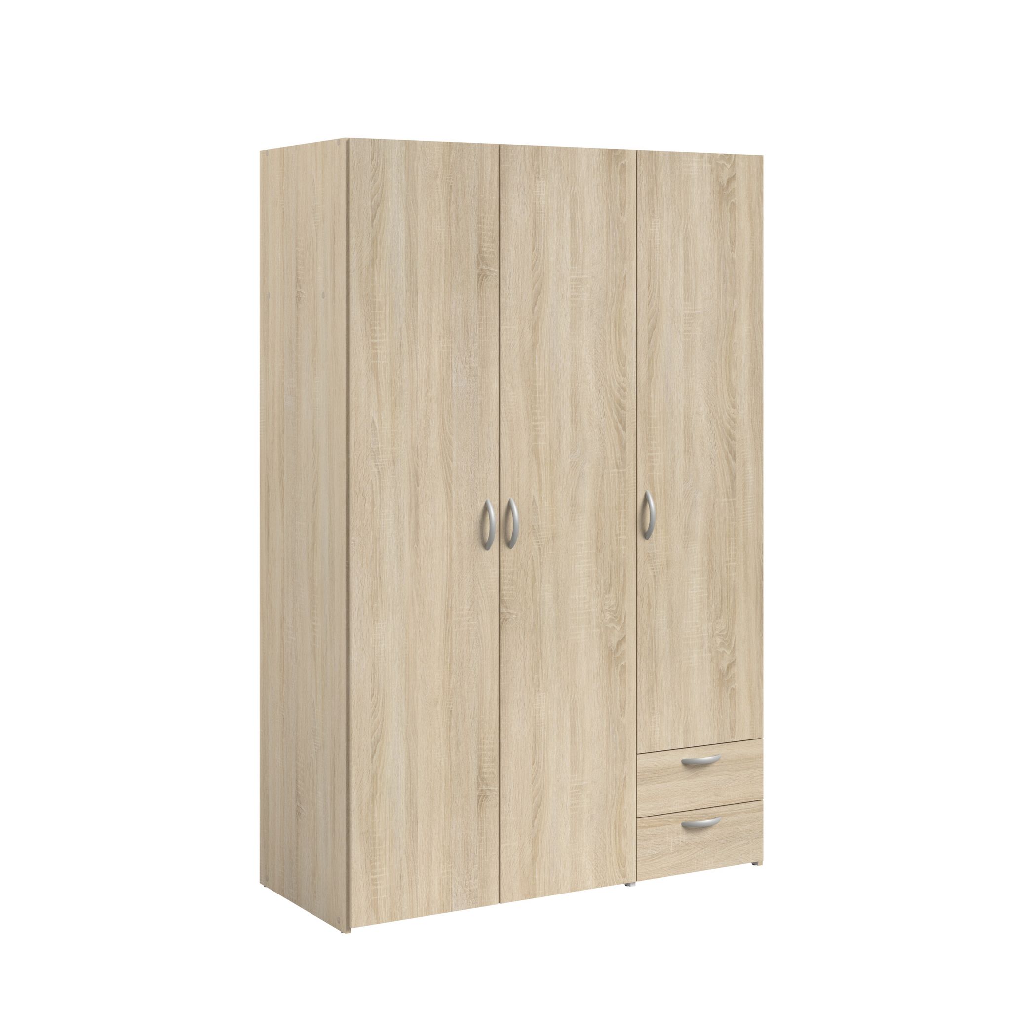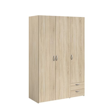 Une armoire simple et fonctionnelle avec trois portes battantes et deux tiroirs, idéale pour obtenir du rangement supplémentaire dans une chambre, dressing ou même un couloir.