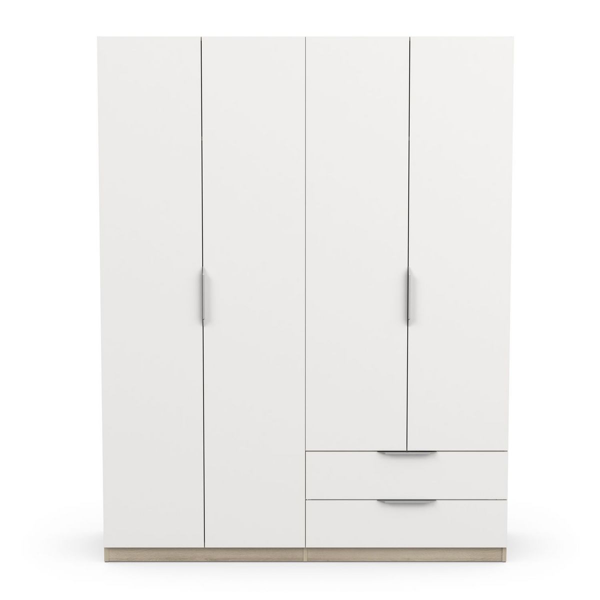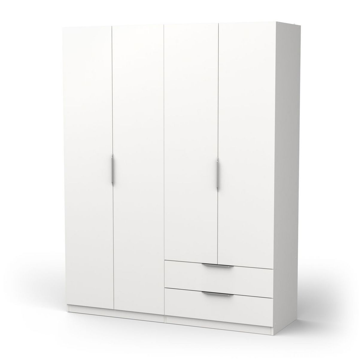 Armoire 4 portes + 2 tiroirs montés sur coulisses à billes, en panneaux de particules 12 et 15mm. Décor papier blanc mat. 1 barre de penderie, charge maximale : 19kg + 3 rayons dont 2 réglables sur 5 niveaux. Dimensions utiles des tiroirs : 73,1 x 38,7 x 10,6 cm ; charge maximale : 5kg.