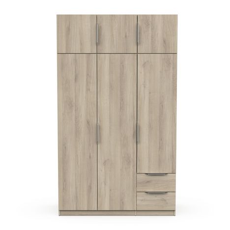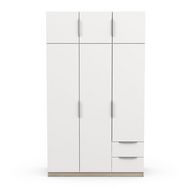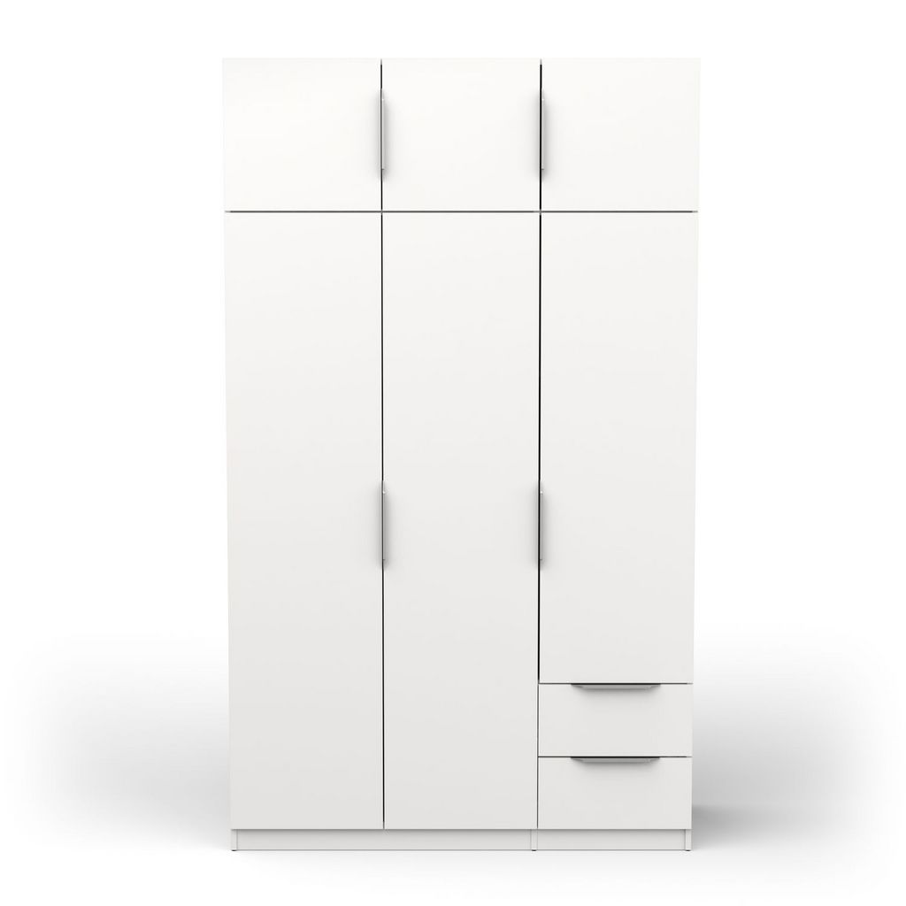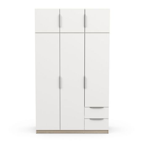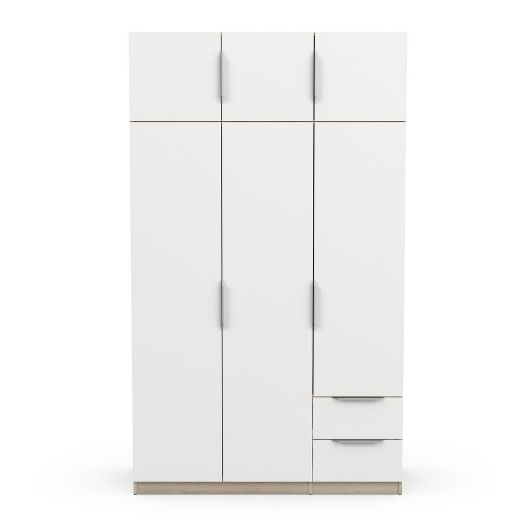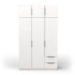 Armoire 6 portes + 2 tiroirs montés sur coulisses à billes, en panneaux de particules 12 et 15mm. Décor papier blanc mat. 1 barre de penderie, charge maximale : 19kg + 3 rayons dont 2 réglables sur 5 niveaux. Dimensions utiles des tiroirs : 35,2 x 38,7 x 10,6 cm ; charge maximale : 2kg