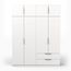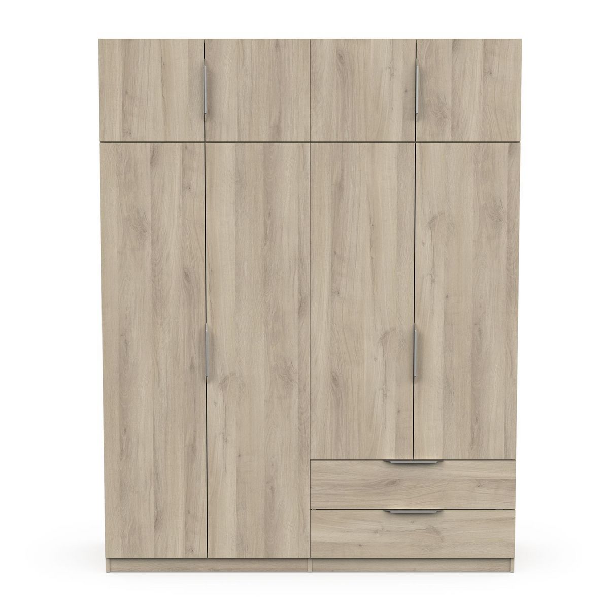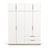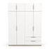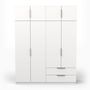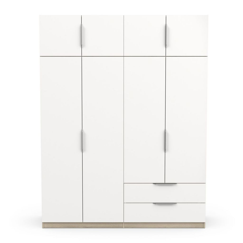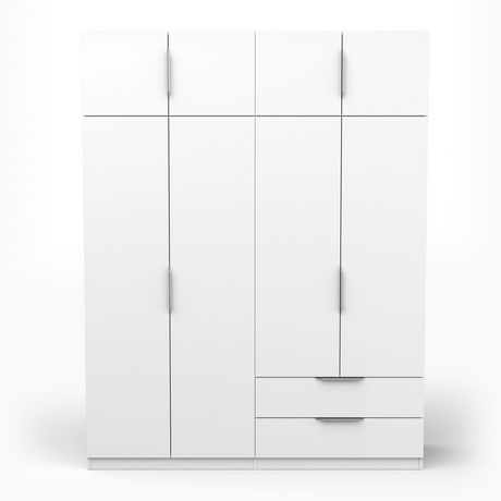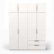 Armoire 8 portes + 2 tiroirs montés sur coulisses à billes, en panneaux de particules 12 et 15mm. Décor papier blanc mat. 1 barre de penderie, charge maximale : 19kg + 3 rayons dont 2 réglables sur 5 niveaux. Dimensions utiles des tiroirs : 73,1 x 38,7 x 10,6 cm ; charge maximale : 5kg.