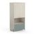 Structure panneaux de particules. Décor papier chêne topanga et mélamine vert de gris. Panneaux de particules, épaisseur 15 mm. Aménagement haut : 1 barre de penderie, 1 rayon fixe (dim 86 X 48 cm, charge max. 17kg) + possibilité de placer 1 rayon réglable sur 3 niveaux (dim 86 x 39 cm, charge max. 14kg). Aménagement bas : 1 rayon réglable sur 3 niveaux (dim 86 x 39 cm, charge max. 14kg). Une niche ouverte avec un rayon fixe (dim. utiles 86 x 48 cm, charge max. 17kg). Pieds en MDF laqués vert de gris, peinture base aqueuse sans métaux lourds. Poignées plastiques de forme arrondie (diam. 5cm), effet chêne topanga.