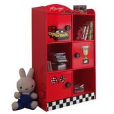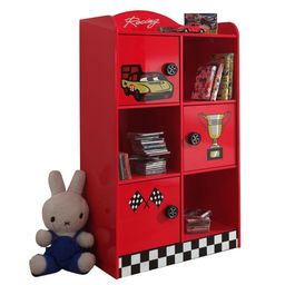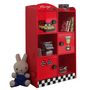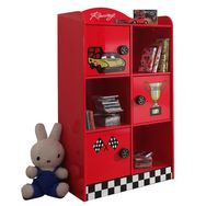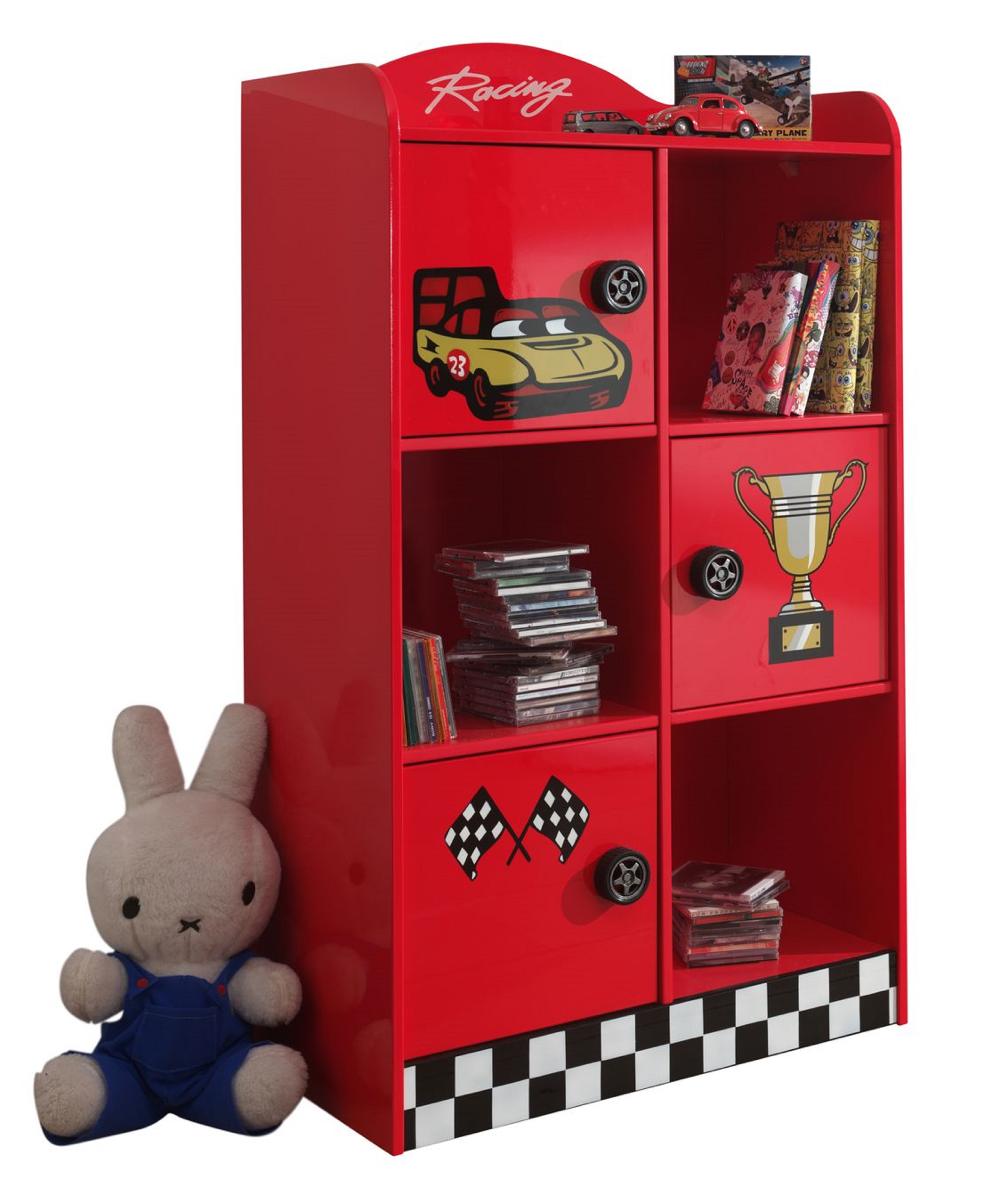 3 portes, 3 niches, poignées en forme de roue de voiture, finition laquée rouge et damier, stickers voiture de course, panneaux de particules