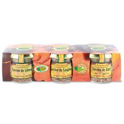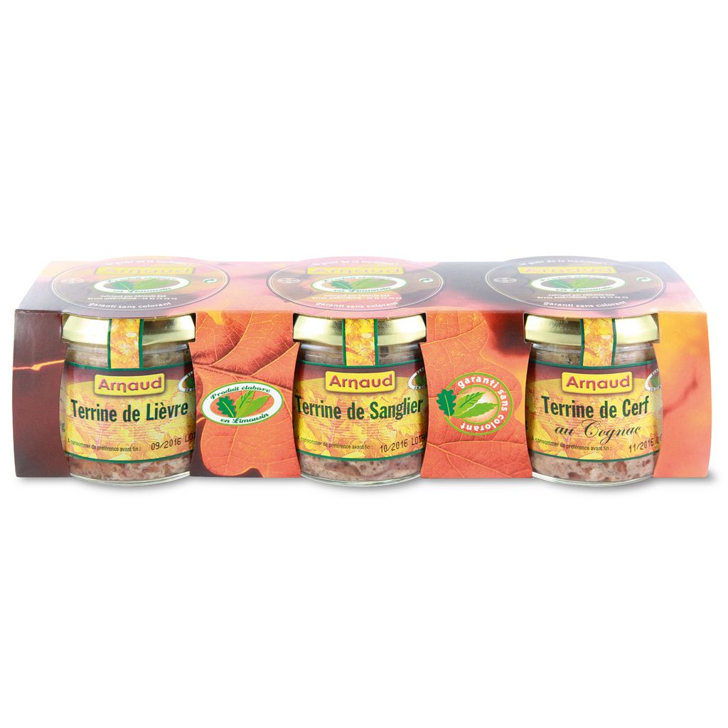 Lot de 3 verrines 180g Terrine de Lièvre au Cognac + Terrine de Sanglier au Cognac + Terrine de Cerf au Cognac Terrines de lièvre, de sanglier et de cerf au cognac