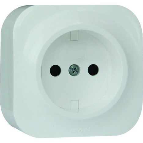 Prise de courant sans terre.Profil éco complet.Appareillage saillie.Forme carrée et galbée.Couleur blanc lumière.Aspect satiné.Gabaris : 6,4 x 6,4 x 3,4 cm.Utilisation en intérieur.
