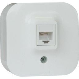 Prise informatique RJ45.Coloris Blanc.Catégorie 5 profil éco complet.Appareillage saillie.Forme carrée et galbée.Couleur blanc lumière aspect satiné.Prise de courant multimédia.