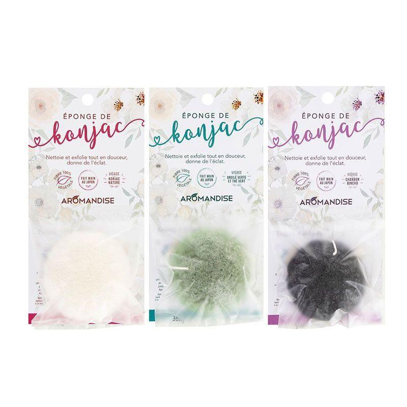Pour nettoyer votre visage et l'exfolier en douceur, découvrez les éponges de Konjac d'Aromandise.