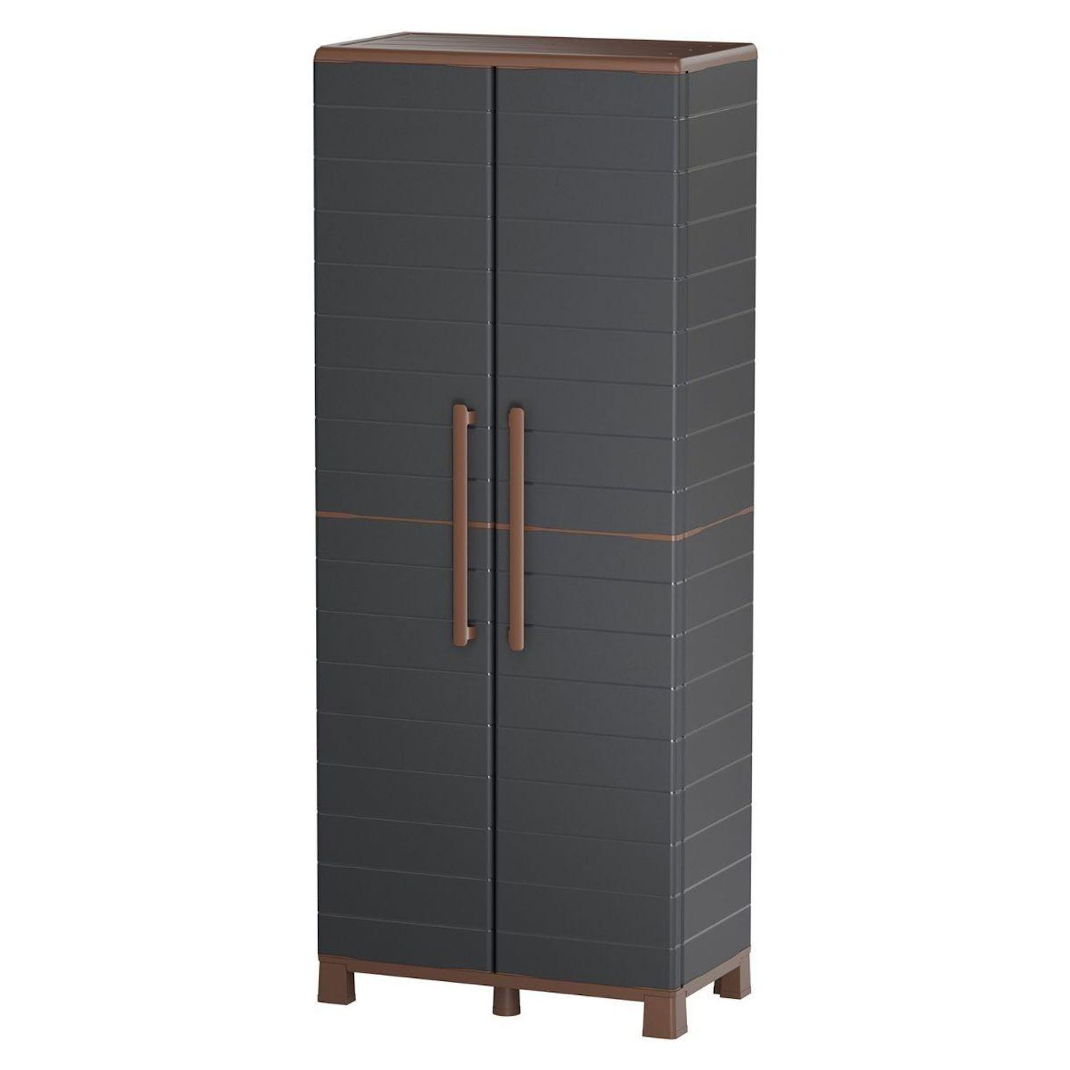 Son design sobre, marron et gris s'intègre à tous les intérieurs et extérieurs. Les 3 étagères réglables et solides (jusqu'à 20 kg chacune) permettent un rangement pratique et structuré. Surélevée sur 4 pieds, l'armoire de rangement bicolore offre une bonne protection contre l'humidité du sol.