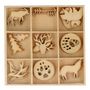 27 embellissements en bois Woodland.Ces mini silhouettes de 2,5 cm représentent des animaux de la forêt (caribou, ours, tête de renne, loup), bois de renne, sapin, empreintes d'ours, flèche.Ils peuvent être décorés à la peinture, collés, ou utilisés bruts.Ils sont disposés dans une boite en bois de 9 cm de côté.