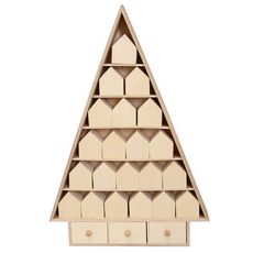 Calendrier de Noël à décorer et à personnaliser en forme de sapin. Il contient 21 cases en formes de maison avec porte aimantée et 3 tiroirs avec poignée, à remplir de chocolats, bonbons et autres surprises pour patienter jusqu'à Noël ! Ce support en bois est idéal pour créer un calendrier de l'Avent original pour vos enfants. Après les fêtes, il pourra ensuite être recyclé en meuble de rangement pour vos accessoires de papeterie ou de Scrapbooking. Personnalisez ce calendrier comme vous le souhaitez en utilisant nos accessoires papeterie et DIY : masking tapes, peinture, paillettes, papier créatif, stickers, formes découpées... Dimensions : 52 x 35 x 6,5 cm. Dimensions des cases : 6 x 5 x 5,5 cm. Matière : bois.